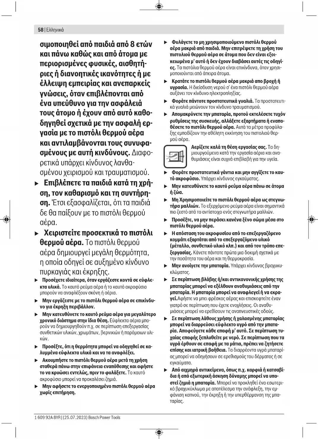 Υποδείξεις ασφαλείας Διαβάστε όλες τις υποδείξεις ασφαλείας και τις οδηγίες. Η μη τήρηση των υποδείξεων ασφαλείας και των οδηγιών μπορεί να προκα- λέσει ηλεκτροπληξία, πυρκαγιά και/ή σοβαρούς τραυματισμούς. Φυλάξτε όλες τις προειδοποιητικές υποδείξεις και οδηγίες για κάθε μελλοντική χρήση. u Αυτό το πιστόλι θερμού αέρα δεν προβλέπεται για χρήση από παιδιά και άτομα με περιορισμένες φυσι- κές, αισθητήριες ή διανοητικές ικα- νότητες ή με έλλειψη εμπειρίας και ανεπαρκείς γνώσεις. Αυτό το πι- στόλι θερμού αέρα μπορεί να χρη- Bosch Power Tools 1 609 92A 8YR | (25.07.2023)58 | Ελληνικά σιμοποιηθεί από παιδιά από 8 ετών και πάνω καθώς και από άτομα με περιορισμένες φυσικές, αισθητή- ριες ή διανοητικές ικανότητες ή με έλλειψη εμπειρίας και ανεπαρκείς γνώσεις, όταν επιβλέπονται από ένα υπεύθυνο για την ασφάλειά τους άτομο ή έχουν από αυτό καθο- δηγηθεί σχετικά με την ασφαλή ερ- γασία με το πιστόλι θερμού αέρα και αντιλαμβάνονται τους συνυφα- σμένους με αυτή κινδύνους. Διαφο- ρετικά υπάρχει κίνδυνος λανθα- σμένου χειρισμού και τραυματισμού. u Επιβλέπετε τα παιδιά κατά τη χρή- ση, τον καθαρισμό και τη συντήρη- ση. Έτσι εξασφαλίζεται, ότι τα παιδιά δε θα παίξουν με το πιστόλι θερμού