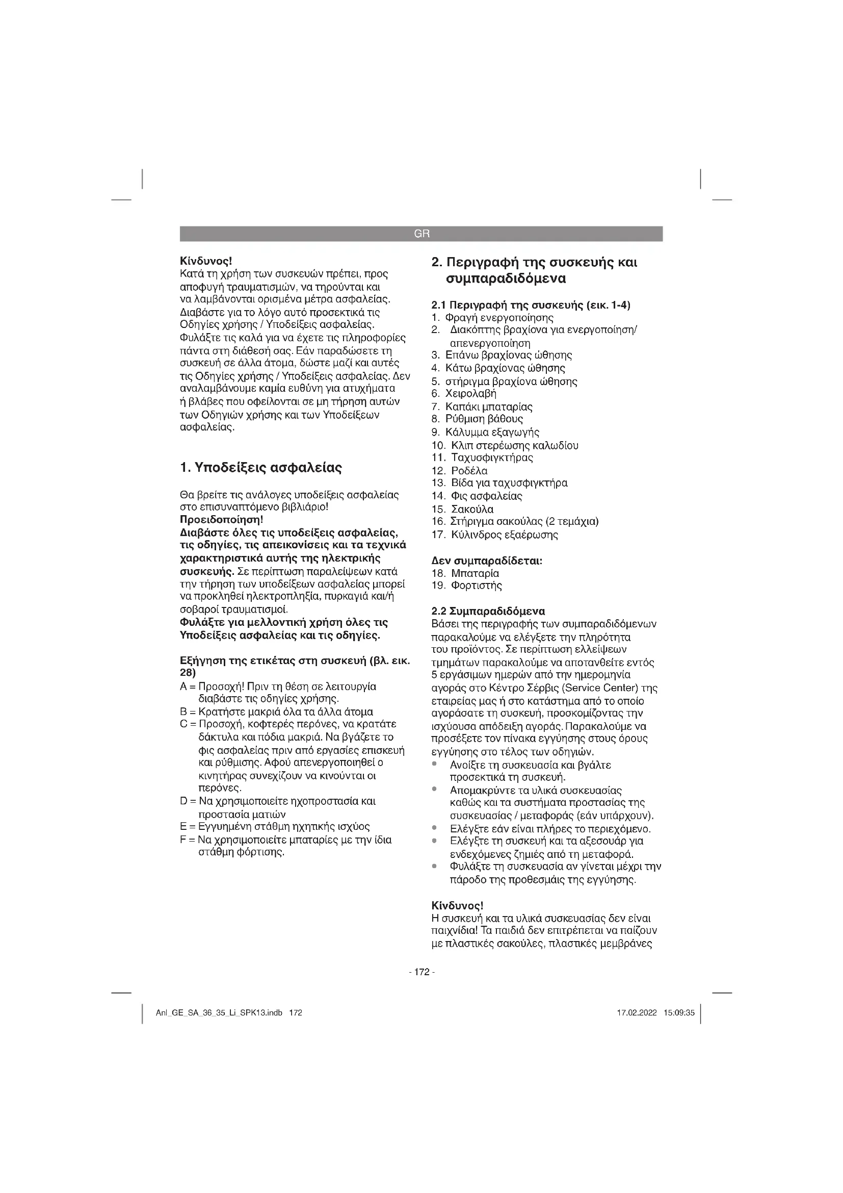 Η συσκευή παραδίδεται χωρίς μπαταρίες και χωρίς φορτιστή και επιτρέπεται να χρησιμοποιείται μόνο με μπαταρίες ιόντων Anl_GE_SA_36_35_Li_SPK13.indb 173Anl_GE_SA_36_35_Li_SPK13.indb 173 17.02.2022 15:09:3517.02.2022 15:09:35GR