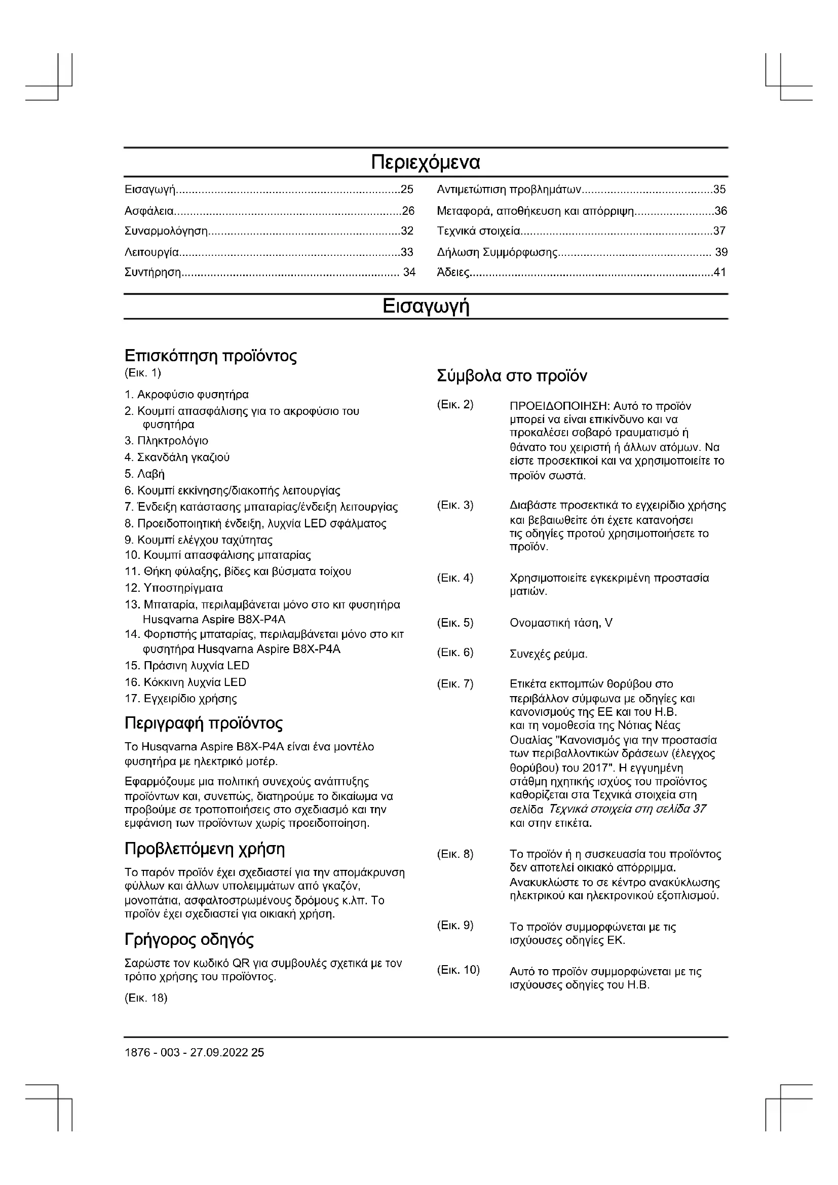 Huskvarna, 2022-06-30 Claes Losdal, Διευθυντής Έρευνας και Ανάπτυξης Husqvarna AB Υπεύθυνος για την τεχνική τεκμηρίωση UK Importer: Husqvarna UK Ltd Preston Road, Co. Durham DL5 6UP 40 1876 - 003 - 27.09.2022Άδειες Copyright