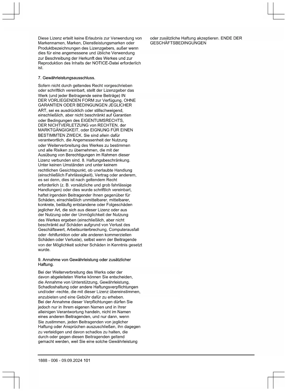 Ως "Άδεια χρήσης" νοούνται οι όροι και οι προϋποθέσεις χρήσης, αναπαραγωγής και διανομής, όπως ορίζονται στις ενότητες 1 έως 9 του παρόντος εγγράφου. Ως "Χορηγός της άδειας χρήσης" νοείται ο κάτοχος των πνευματικών δικαιωμάτων ή ο φορέας που έχει εξουσιοδοτηθεί από τον κάτοχο των πνευματικών δικαιωμάτων για τη χορήγηση της άδειας χρήσης. Ως "Νομική οντότητα" νοείται η ένωση της ενεργούσας οντότητας και όλων των άλλων οντοτήτων που ελέγχουν, ελέγχονται ή τελούν υπό κοινό έλεγχο με την εν λόγω οντότητα. Για τους σκοπούς του παρόντος ορισμού, ως "έλεγχος" νοείται i) η εξουσία, άμεση ή έμμεση, για τη διεύθυνση ή διαχείριση της εν λόγω οντότητας είτε βάσει σύμβασης είτε με άλλο τρόπο, ή ii) η κυριότητα του πενήντα τοις εκατό (50%) ή περισσότερων εν κυκλοφορία μετοχών, ή iii) η πραγματική κυριότητα της εν λόγω οντότητας. Με τον όρο "Εσείς" (ή "Σας") νοείται ένα φυσικό ή νομικό πρόσωπο που ασκεί δικαιώματα τα οποία εκχωρούνται από την παρούσα Άδεια χρήσης. Ως "Πηγαία μορφή" νοείται η προτιμώμενη μορφή για την εκτέλεση τροποποιήσεων και συμπεριλαμβάνει, ενδεικτικά, τον πηγαίο κώδικα του λογισμικού, την πηγή τεκμηρίωσης και τα αρχεία διαμόρφωσης. Ως "Μορφή αντικειμένου" νοείται κάθε μορφή που προκύπτει από τον μηχανικό μετασχηματισμό ή μετάφραση μιας πηγαίας μορφής και συμπεριλαμβάνει, ενδεικτικά, τον μεταγλωττισμένο αντικειμενικό κώδικα, την παραγόμενη τεκμηρίωση και τις μετατροπές σε άλλους τύπους μέσων. Ως "Έργο" νοείται το έργο ενός δημιουργού, είτε σε πηγαία μορφή είτε σε μορφή αντικειμένου, το οποίο διατίθεται βάσει της Άδειας χρήσης, όπως υποδεικνύεται από μια γνωστοποίηση περί πνευματικών δικαιωμάτων που περιλαμβάνεται ή επισυνάπτεται στο έργο (ένα παράδειγμα παρέχεται στο παρακάτω Παράρτημα). Ως "Παράγωγα έργα" νοείται κάθε έργο, είτε σε πηγαία μορφή είτε σε μορφή αντικειμένου, που βασίζεται στο (ή προέρχεται από το) έργο και για το οποίο οι συντακτικές αναθεωρήσεις, τα σχόλια, οι επεξηγήσεις ή άλλες τροποποιήσεις αντιπροσωπεύουν, συνολικά, ένα πρωτότυπο έργο δημιουργού. Για τους σκοπούς της παρούσας Άδειας χρήσης, τα Παράγωγα έργα δεν περιλαμβάνουν έργα που παραμένουν διαχωρισμένα από ή απλώς συνδέονται (ή συνδέονται κατά όνομα) με τις διεπαφές του Έργου και των Παράγωγων έργων αυτού. Ως "Συνεισφορά" νοείται κάθε έργο δημιουργού, συμπεριλαμβανομένης της αρχικής έκδοσης του έργου και τυχόν τροποποιήσεων ή προσθηκών στο έργο αυτό ή σε παράγωγα έργα του, που υποβάλλεται σκόπιμα στον Χορηγό της άδειας χρήσης 1888 - 006 - 09.09.2024 119για να συμπεριληφθεί στο Έργο από τον κάτοχο των πνευματικών δικαιωμάτων ή από ένα άτομο ή μια Νομική οντότητα που έχει εξουσιοδοτηθεί για υποβολή εκ μέρους του κατόχου των πνευματικών δικαιωμάτων. Για τους σκοπούς του παρόντος ορισμού ως "υποβληθείσα" νοείται κάθε μορφή ηλεκτρονικής, προφορικής ή γραπτής επικοινωνίας που αποστέλλεται στον Χορηγό της άδειας χρήσης ή στους εκπροσώπους του, συμπεριλαμβανομένης, μεταξύ άλλων, της επικοινωνίας σε ηλεκτρονικές λίστες αλληλογραφίας, συστήματα ελέγχου πηγαίου κώδικα και συστήματα παρακολούθησης προβλημάτων τα οποία διαχειρίζεται ο Χορηγός της άδειας χρήσης ή άλλα μέρη για λογαριασμό του, με σκοπό τη συζήτηση και τη βελτίωση του Έργου, εξαιρουμένης της επικοινωνίας που επισημαίνεται εμφανώς ή ορίζεται με άλλο τρόπο εγγράφως από τον κάτοχο των πνευματικών δικαιωμάτων ως "Μη