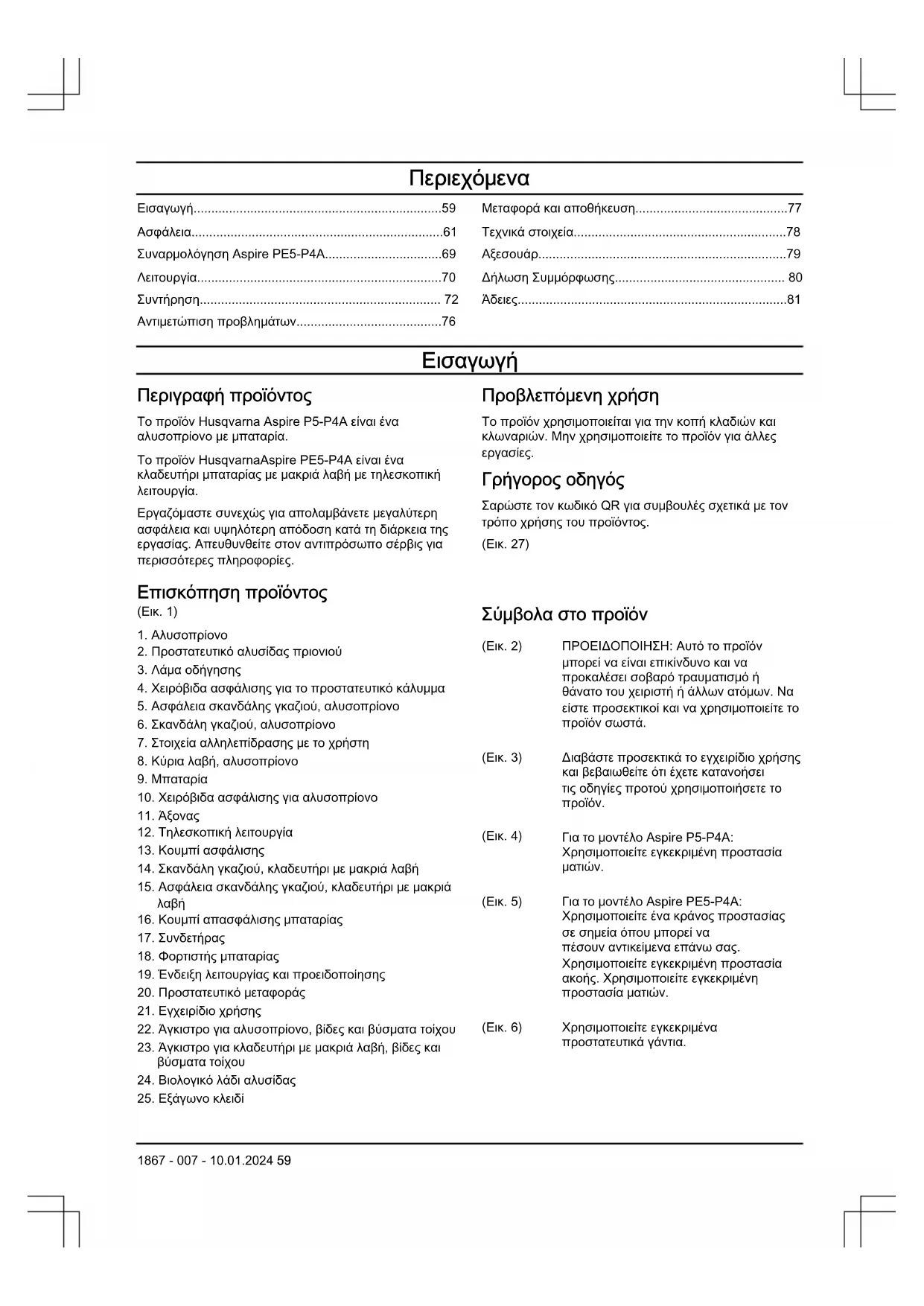 Περιγραφή προϊόντος Το προϊόν Husqvarna Aspire P5-P4A είναι ένα αλυσοπρίονο με μπαταρία. Το προϊόν HusqvarnaAspire PE5-P4A είναι ένα κλαδευτήρι μπαταρίας με μακριά λαβή με τηλεσκοπική λειτουργία. Εργαζόμαστε συνεχώς για απολαμβάνετε μεγαλύτερη ασφάλεια και υψηλότερη απόδοση κατά τη διάρκεια της εργασίας. Απευθυνθείτε στον αντιπρόσωπο σέρβις για περισσότερες πληροφορίες. Προβλεπόμενη χρήση Το προϊόν χρησιμοποιείται για την κοπή κλαδιών και κλωναριών. Μην χρησιμοποιείτε το προϊόν για άλλες