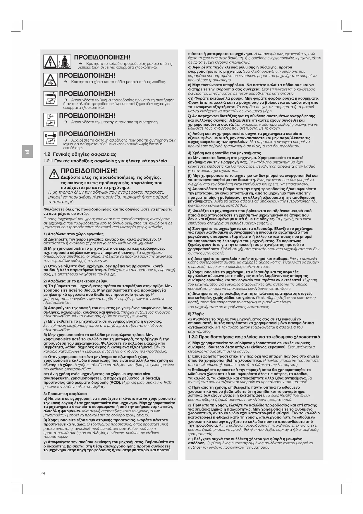 daΠΡΟΕΙΔΟΠΟΙΗΣΗ! Æ Κρατήστε το καλώδιο τροφοδοσίας μακριά από τις λεπίδες (δεν ισχύει για ασύρματα χλοοκοπτικά). ΠΡΟΕΙΔΟΠΟΙΗΣΗ! Æ Κρατήστε τα χέρια και τα πόδια μακριά από τις λεπίδες. ΠΡΟΕΙΔΟΠΟΙΗΣΗ! Æ Αποσυνδέστε το βύσμα τροφοδοσίας πριν από τη συντήρηση ή αν το καλώδιο τροφοδοσίας έχει υποστεί ζημιά (δεν ισχύει για ασύρματα χλοοκοπτικά). ΠΡΟΕΙΔΟΠΟΙΗΣΗ! Æ Αποσυνδέστε την μπαταρία πριν από τη συντήρηση. ΠΡΟΕΙΔΟΠΟΙΗΣΗ! Æ Αφαιρέστε τη διάταξη ασφάλισης πριν από τη συντήρηση (δεν ισχύει για ασύρματα ωθούμενα χλοοκοπτικά χωρίς διάταξη ασφάλισης).