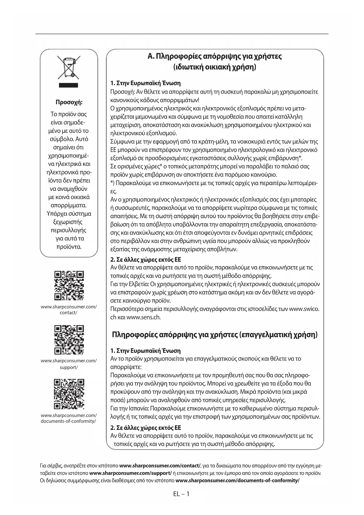 Αν θέλετε να απορρίψετε αυτό το προϊόν, παρακαλούμε να επικοινωνήσετε με τις τοπικές αρχές και να ρωτήσετε για τη σωστή μέθοδο απόρριψης. Για σέρβις, ανατρέξτε στον ιστότοπο www.sharpconsumer.com/contact/, για τα δικαιώματα που απορρέουν από την εγγύηση με- ταβείτε στον ιστότοπο www.sharpconsumer.com/support/ ή επικοινωνήστε με τον έμπορο από τον οποίο αγοράσατε το προϊόν. Οι δηλώσεις συμμόρφωσης είναι διαθέσιμες από τον ιστότοπο www.sharpconsumer.com/documents-of-conformity/ www.sharpconsumer.com/ support/ www.sharpconsumer.com/ documents-of-conformity/ www.sharpconsumer.com/ contact/EL EL – 1EL – 1