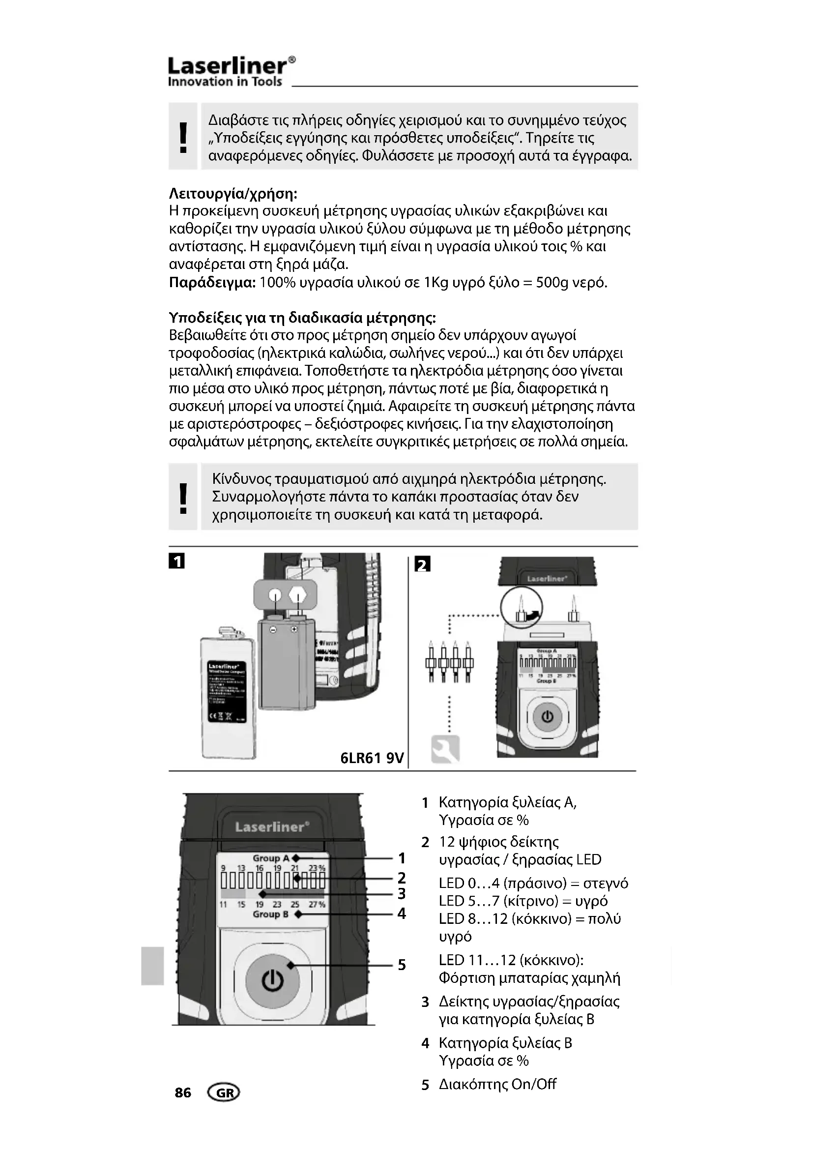 LED 11…12 (κόκκινο): Φόρτιση μπαταρίας χαμηλή Δείκτης υγρασίας/ξηρασίας για κατηγορία ξυλείας B Κατηγορία ξυλείας B Υγρασία σε % Διακόπτης On/O Κίνδυνος τραυµατισµού από αιχµηρά ηλεκτρόδια µέτρησης. Συναρµολογήστε πάντα το καπάκι προστασίας όταν δεν χρησιµοποιείτε τη συσκευή και κατά τη µεταφορά.