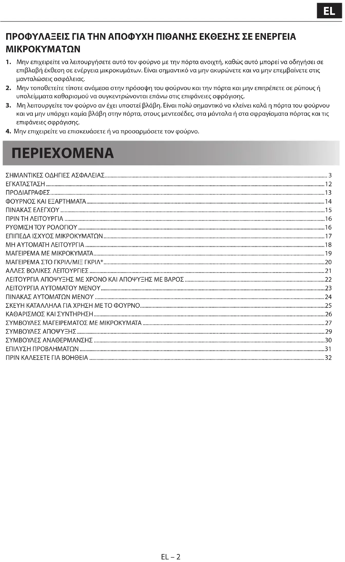 www.sharpconsumer.com/ support/ www.sharpconsumer.com/ documents-of-conformity/ www.sharpconsumer.com/ contact/ Για σέρβις, ανατρέξτε στον ιστότοπο www.sharpconsumer.com/contact/, για τα δικαιώματα που απορρέουν από την εγγύηση μεταβείτε στον ιστότοπο www.sharpconsumer.com/support/ ή επικοινωνήστε με τον έμπορο από τον οποίο αγοράσατε το προϊόν. Οι δηλώσεις συμμόρφωσης είναι διαθέσιμες από τον ιστότοπο www.sharpconsumer.com/documents-of-conformity/EL EL – 2 EL – 2 ΠΡΟΦΥΛΑΞΕΙΣ ΓΙΑ ΤΗΝ ΑΠΟΦΥΧΗ ΠΙΘΑΝΗΣ ΕΚΘΕΣΗΣ ΣΕ ΕΝΕΡΓΕΙΑ ΜΙΚΡΟΚΥΜΑΤΩΝ