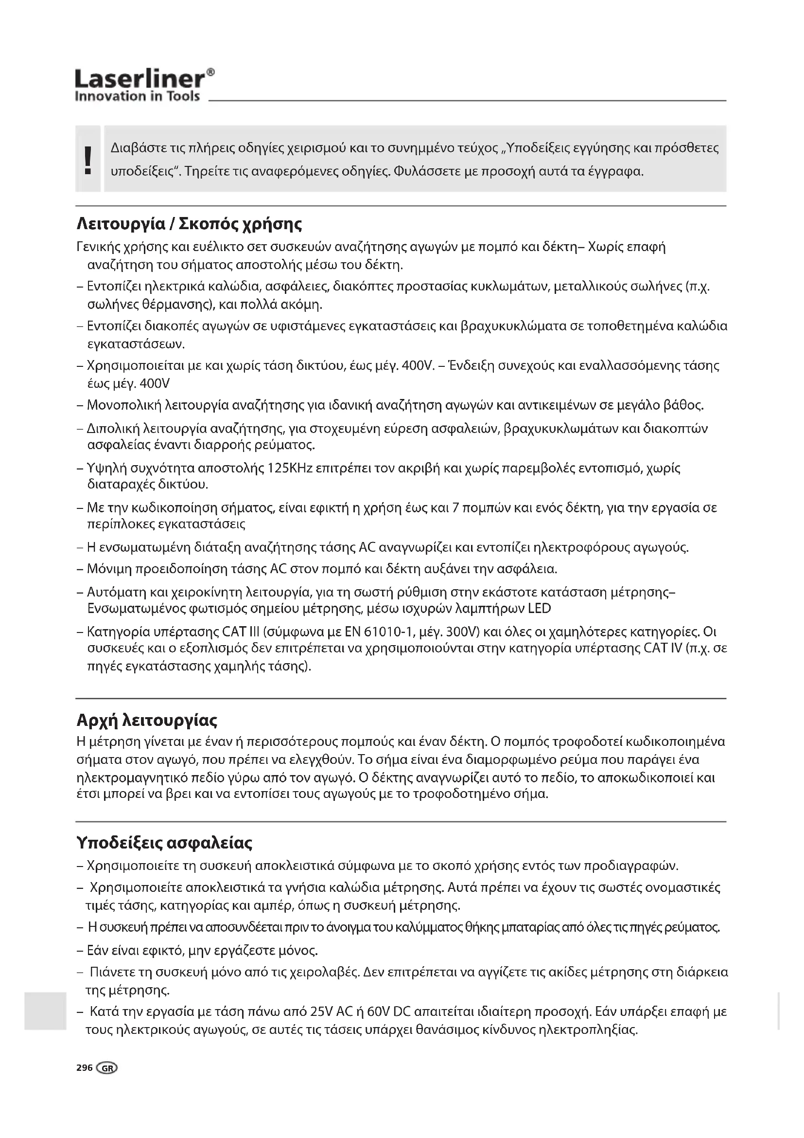Manual_CableTracer-Pro_Rev.0710_BG.indd 295 02.09.2010 11:42:34 Uhrιαβάστε τι πλήρει οδηγίε χειρισού και το συνηένο τεύχο „Υποδείξει εγγύηση και πρόσθετε υποδείξει“. Τηρείτε τι αναφερόενε οδηγίε. Φυλάσσετε ε προσοχή αυτά τα έγγραφα.