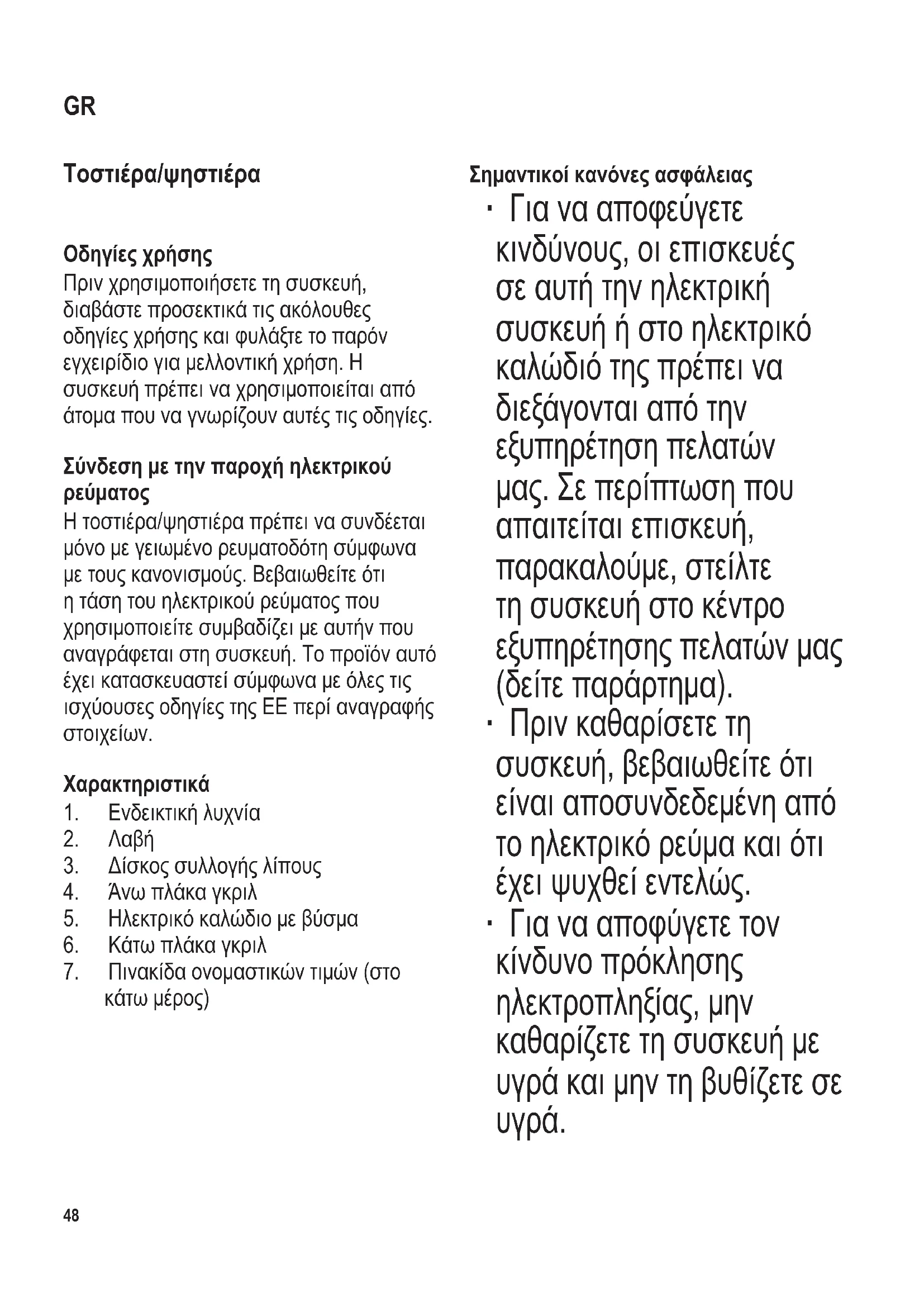 Προσοχή:Αυτότο σύμβολουποδεικνύειότιοι προσβάσιμεςεπιφάνειες τουπεριβλήματοςμπορεί ναθερμανθούνπάραπολύ κατάτηλειτουργία.Μην αγγίζετεκανέναμέροςτης συσκευήςεκτόςαπότη λαβή.Ναχρησιμοποιείτε κατάλληλαπανιάγια φούρνο,εάναπαιτείται. ∙ Ησυσκευήαυτή προορίζεταιγιαοικιακή χρήσηήπαρόμοιες χρήσεις,όπωςγια παράδειγμα: - σεκουζίνεςεταιρειών, σεγραφείακαιάλλα εργασιακάπεριβάλλοντα, - σεγεωργικέςεταιρείες, - απόπελάτεςσε ξενοδοχεία,πανδοχεία κτλ.καιπαρόμοιες εγκαταστάσεις, - σεξενώνεςπου σερβίρουνπρωινό. ∙ Ησυσκευήαυτήμπορεί ναχρησιμοποιηθείαπό παιδιά(τουλάχιστον8 χρονών)καιαπόάτομα μεμειωμένεςφυσικές, αισθητήριεςήδιανοητικές ικανότητεςήχωρίς πείρακαιγνώσεις,αν επιτηρούνταιήτουςέχουν δοθείοδηγίεςσχετικάμε τηχρήσητηςσυσκευής καικατανοούνπλήρως50 104 x 142 mm όλουςτουςεμπλεκόμενους κίνδυνουςκαιπροφυλάξεις γιατηνασφάλεια. ∙ Ταπαιδιάδενπρέπεινα επιτρέπεταιναπαίζουνμε