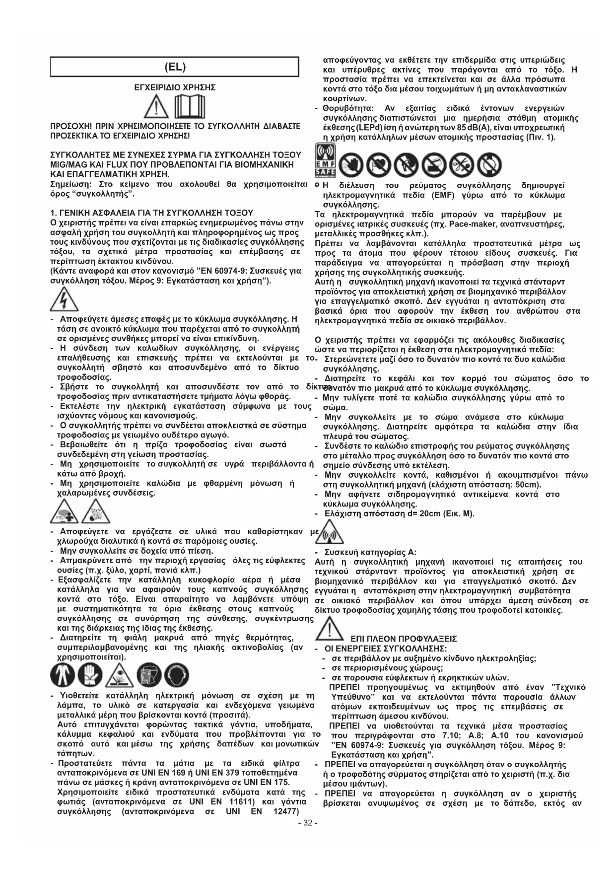 ΚΑΙΕΠΑΓΓΕΛΜΑΤΙΚΗΧΡΗΣΗ. Σημείωση: Στο κείμενο που ακολουθεί θα χρησιμοποιείται ο όρος“συγκολλητής”. 1.ΓΕΝΙΚΗΑΣΦΑΛΕΙΑΓΙΑΤΗΣΥΓΚΟΛΛΗΣΗΤΟΞΟΥ Οχειριστήςπρέπειναείναιεπαρκώςενημερωμένοςπάνωστην ασφαλήχρήσητουσυγκολλητήκαιπληροφορημένοςωςπρος τουςκινδύνουςπουσχετίζονταιμετιςδιαδικασίεςσυγκόλλησης τόξου, τα σχετικά μέτρα προστασίας και επέμβασης σε περίπτωσηέκτακτουκινδύνου. (Κάντεαναφοράκαιστονκανονισμό”EN60974-9:Συσκευέςγια συγκόλλησητόξου.Μέρος9:Εγκατάστασηκαιχρήση”). - Αποφεύγετεάμεσεςεπαφέςμετοκύκλωμασυγκόλλησης.Η τάσησεανοικτόκύκλωμαπουπαρέχεταιαπότοσυγκολλητή σεορισμένεςσυνθήκεςμπορείναείναιεπικίνδυνη. - Η σύνδεση των καλωδίων συγκόλλησης, οι ενέργειες επαλήθευσης και επισκευής πρέπει να εκτελούνται με το συγκολλητή σβηστό και αποσυνδεμένο από το δίκτυο τροφοδοσίας. - Σβήστε το συγκολλητή και αποσυνδέστε τον από το δίκτυο τροφοδοσίαςπριναντικαταστήσετετμήματαλόγωφθοράς. - Εκτελέστε την ηλεκτρική εγκατάσταση σύμφωνα με τους ισχύοντεςνόμουςκαικανονισμούς. - Οσυγκολλητήςπρέπεινασυνδέεταιαποκλειστκάσεσύστημα τροφοδοσίαςμεγειωμένοουδέτεροαγωγό. - Βεβαιωθείτε ότι η πρίζα τροφοδοσίας είναι σωστά συνδεδεμένηστηγείωσηπροστασίας. - Μη χρησιμοποιείτε τοσυγκολλητήσε υγρά περιβάλλονταή κάτωαπόβροχή. - Μη χρησιμοποιείτε καλώδια με φθαρμένη μόνωση ή χαλαρωμένεςσυνδέσεις. - Αποφεύγετε να εργάζεστε σε υλικά που καθαρίστηκαν με χλωρούχαδιαλυτικάήκοντάσεπαρόμοιεςουσίες. - Μηνσυγκολλείτεσεδοχείαυπόπίεση. - Απμακρύνετεαπό τηνπεριοχήεργασίας όλεςτιςεύφλεκτες ουσίες(π.χ.ξύλο,χαρτί,πανιάκλπ.) - Εξασφαλίζετε την κατάλληλη κυκοφλορία αέρα ή μέσα κατάλληλα για να αφαιρούν τους καπνούς συγκόλλησης κοντά στο τόξο. Είναι απαραίτητo να λαμβάνετε υπόψη με συστηματικότητα τα όρια έκθεσης στους καπνούς συγκόλλησης σε συνάρτηση της σύνθεσης, συγκέντρωσης καιτηςδιάρκειαςτηςίδιαςτηςέκθεσης. - Διατηρείτε τη φιάλη μακρυά από πηγές θερμότητας, συμπεριλαμβανομένης και της ηλιακής ακτινοβολίας (αν χρησιμοποιείται). - Υιοθετείτε κατάλληλη ηλεκτρική μόνωση σε σχέση με τη λάμπα, το υλικό σε κατεργασία και ενδεχόμενα γειωμένα μεταλλικάμέρηπουβρίσκονταικοντά(προσιτά). Αυτό επιτυγχάνεται φορώντας τακτικά γάντια, υποδήματα, κάλυμμα κεφαλιού και ενδύματα που προβλέπονται για το σκοπό αυτό καιμέσω της χρήσης δαπέδων καιμονωτικών