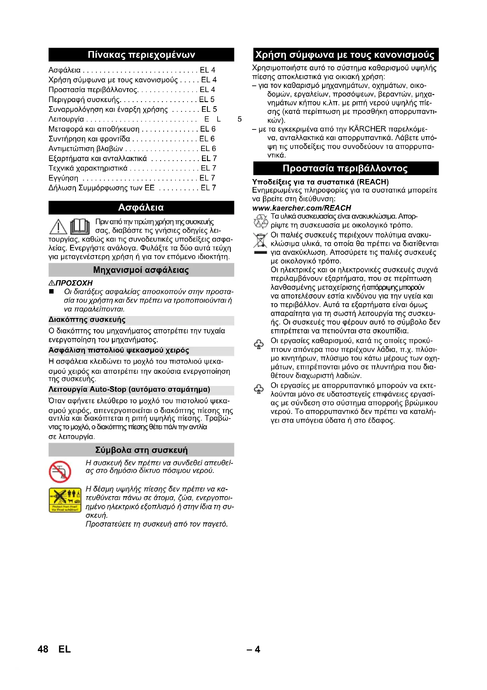 Υποδείξεις για τα συστατικά (REACH) Ενημερωμένες πληροφορίες για τα συστατικά μπορείτε να βρείτε στη διεύθυνση: www.kaercher.com/REACH Πίνακας περιεχομένων Ασφάλεια . . . . . . . . . . . . . . . . . . . . . . . . . . . . EL 4 Χρήση σύμφωνα με τους κανονισμούς . . . . . EL 4 Προστασία περιβάλλοντος. . . . . . . . . . . . . . . EL 4 Περιγραφή συσκευής. . . . . . . . . . . . . . . . . . . EL 5 Συναρμολόγηση και έναρξη χρήσης . . . . . . . EL 5 Λειτουργία . . . . . . . . . . . . . . . . . . . . . . . . . . .EL 5 Μεταφορά και αποθήκευση . . . . . . . . . . . . . . EL 6 Συντήρηση και φροντίδα . . . . . . . . . . . . . . . . EL 6 Αντιμετώπιση βλαβών . . . . . . . . . . . . . . . . . . EL 6 Εξαρτήματα και ανταλλακτικά . . . . . . . . . . . . EL 7 Τεχνικά χαρακτηριστικά . . . . . . . . . . . . . . . . . EL 7 Εγγύηση . . . . . . . . . . . . . . . . . . . . . . . . . . . . EL 7 Δήλωση Συμμόρφωσης των ΕE . . . . . . . . . . EL 7