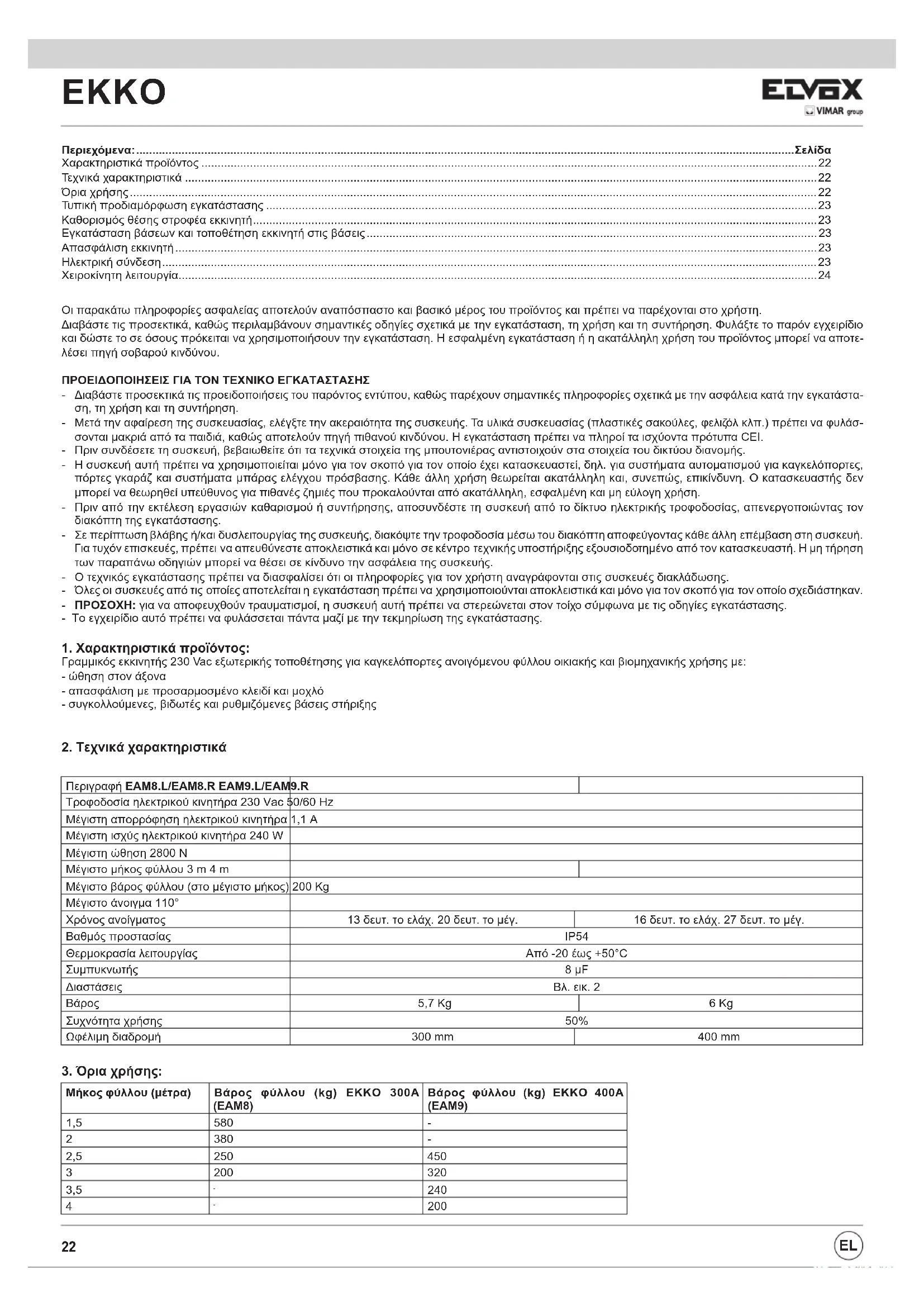 Περιγραφή EAM8.L/EAM8.R EAM9.L/EAM9.R Τροφοδοσία ηλεκτρικού κινητήρα 230 Vac 50/60 Hz Μέγιστη απορρόφηση ηλεκτρικού κινητήρα 1,1 A Μέγιστη ισχύς ηλεκτρικού κινητήρα 240 W Μέγιστη ώθηση 2800 N Μέγιστο μήκος φύλλου 3 m 4 m Μέγιστο βάρος φύλλου (στο μέγιστο μήκος) 200 Kg Μέγιστο άνοιγμα 110° Χρόνος ανοίγματος 13 δευτ. το ελάχ. 20 δευτ. το μέγ. 16 δευτ. το ελάχ. 27 δευτ. το μέγ. Βαθμός προστασίας IP54 Θερμοκρασία λειτουργίας Από -20 έως +50°C Συμπυκνωτής 8 μF Διαστάσεις Βλ. εικ. 2 Βάρος 5,7 Kg 6 Kg Συχνότητα χρήσης 50% Ωφέλιμη διαδρομή 300 mm 400 mm Μήκος φύλλου (μέτρα) Βάρος φύλλου (kg) EKKO 300A (EAM8) Βάρος φύλλου (kg) EKKO 400A (EAM9) 1,5 580 - 2 380 - 2,5 250 450