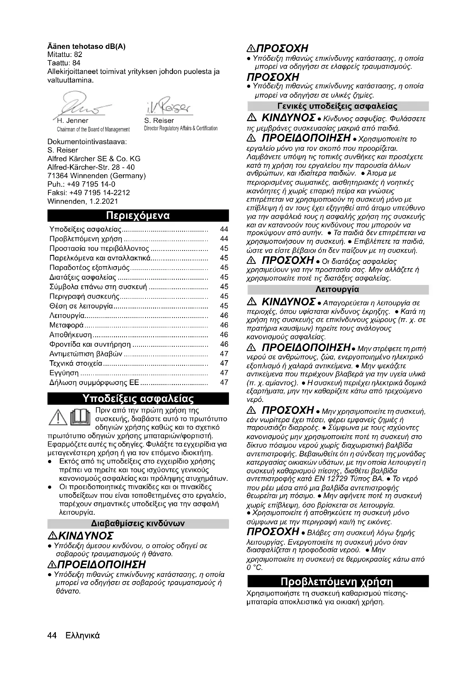 dB(A) 8444 Ελληνικά Äänen tehotaso dB(A) Mitattu: 82 Taattu: 84 Allekirjoittaneet toimivat yrityksen johdon puolesta ja valtuuttamina. Dokumentointivastaava: S. Reiser Alfred Kärcher SE & Co. KG Alfred-Kärcher-Str. 28 - 40 71364 Winnenden (Germany) Puh.: +49 7195 14-0 Faksi: +49 7195 14-2212 Winnenden, 1.2.2021 Περιεχόμενα Υποδείξεις ασφαλείας Πριν από την πρώτη χρήση της συσκευής, διαβάστε αυτό το πρωτότυπο οδηγιών χρήσης καθώς και το σχετικό πρωτότυπο οδηγιών χρήσης μπαταριών/φορτιστή. Εφαρμόζετε αυτές τις οδηγίες. Φυλάξτε τα εγχειρίδια για μεταγενέστερη χρήση ή για τον επόμενο ιδιοκτήτη. ●Εκτός από τις υποδείξεις στο εγχειρίδιο χρήσης πρέπει να τηρείτε και τους ισχύοντες γενικούς κανονισμούς ασφαλείας και πρόληψης ατυχημάτων. ●Οι προειδοποιητικές πινακίδες και οι πινακίδες υποδείξεων που είναι τοποθετημένες στο εργαλείο, παρέχουν σημαντικές υποδείξεις για την ασφαλή λειτουργία. Διαβαθμίσεις κινδύνων