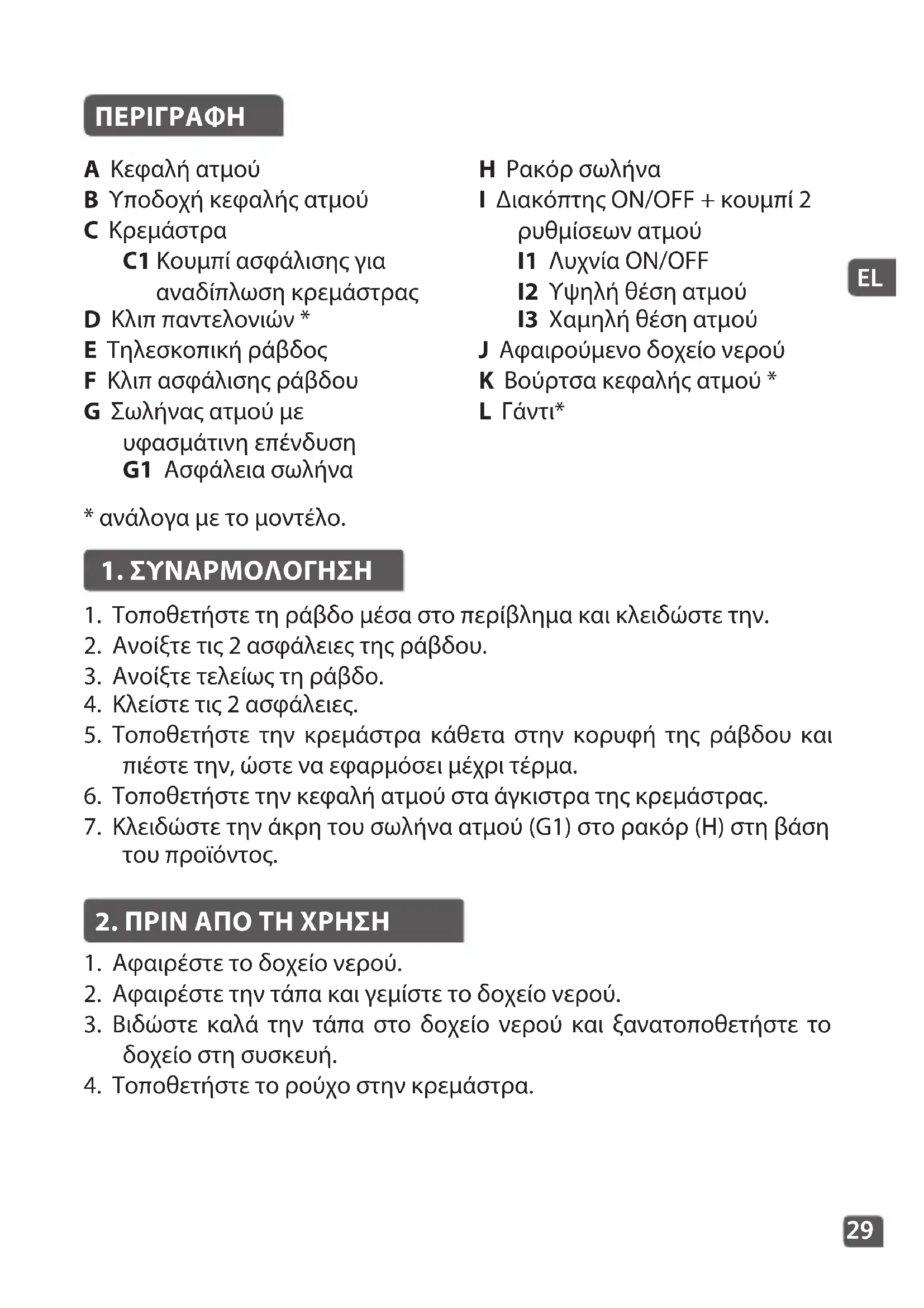 A Κεφαλή ατμού B Υποδοχή κεφαλής ατμού C Κρεμάστρα C1 Κουμπί ασφάλισης για αναδίπλωση κρεμάστρας D Κλιπ παντελονιών * E Τηλεσκοπική ράβδος F Κλιπ ασφάλισης ράβδου G Σωλήνας ατμού με υφασμάτινη επένδυση G1 Ασφάλεια σωλήνα H Ρακόρ σωλήνα I Διακόπτης ON/OFF + κουμπί 2 ρυθμίσεων ατμού I1 Λυχνία ON/OFF I2 Υψηλή θέση ατμού I3 Χαμηλή θέση ατμού J Αφαιρούμενο δοχείο νερού K Βούρτσα κεφαλής ατμού * L Γάντι*