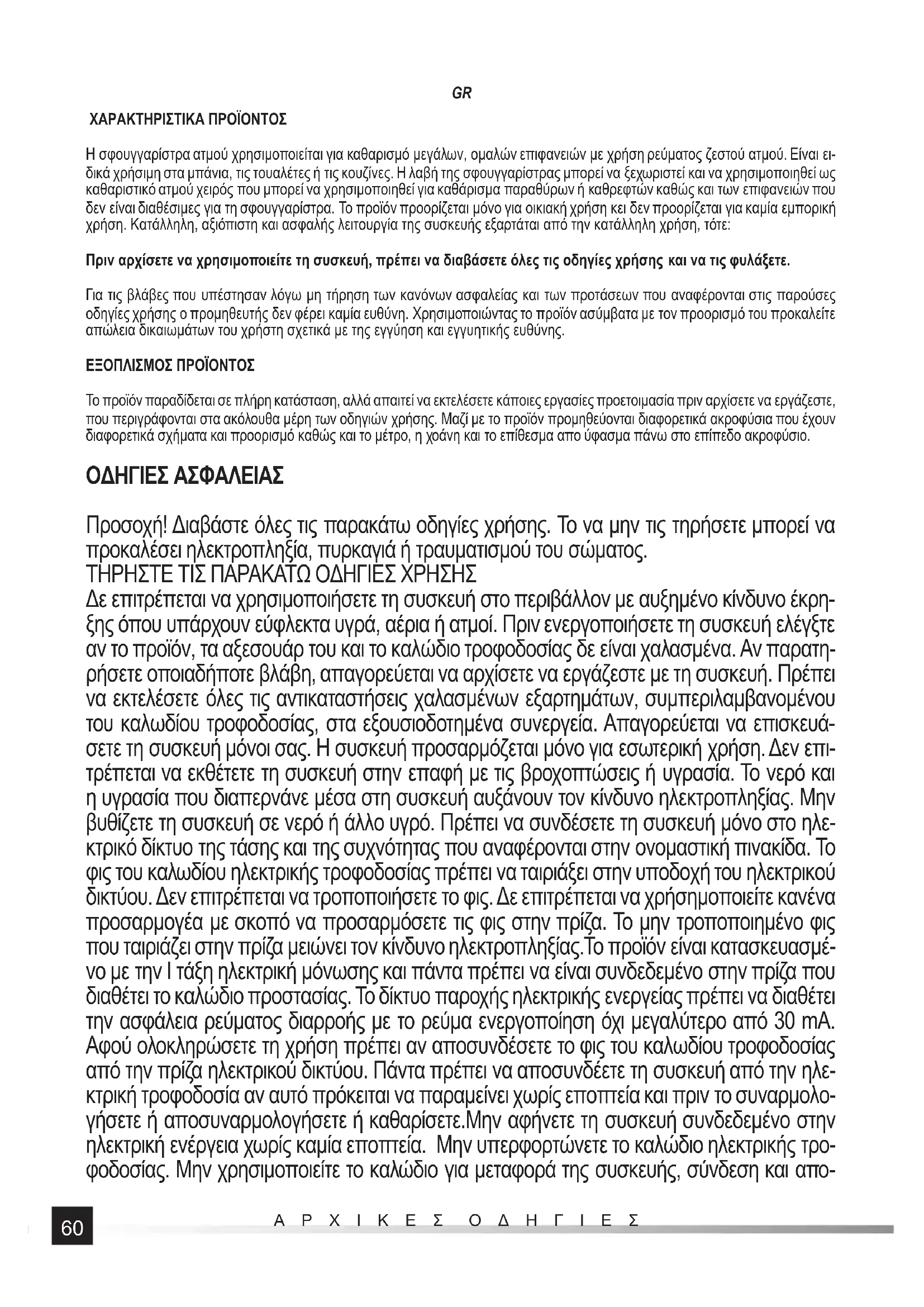 ΧΑΡΑΚΤΗΡΙΣΤΙΚΑ ΠΡΟΪΟΝΤΟΣ Η σφουγγαρίστρα ατμού χρησιμοποιείται για καθαρισμό μεγάλων, ομαλών επιφανειών με χρήση ρεύματος ζεστού ατμού. Είναι ει- δικά χρήσιμη στα μπάνια, τις τουαλέτες ή τις κουζίνες. Η λαβή της σφουγγαρίστρας μπορεί να ξεχωριστεί και να χρησιμοποιηθεί ως καθαριστικό ατμού χειρός που μπορεί να χρησιμοποιηθεί για καθάρισμα παραθύρων ή καθρεφτών καθώς και των επιφανειών που δεν είναι διαθέσιμες για τη σφουγγαρίστρα. Το προϊόν προορίζεται μόνο για οικιακή χρήση κει δεν προορίζεται για καμία εμπορική χρήση. Κατάλληλη, αξιόπιστη και ασφαλής λειτουργία της συσκευής εξαρτάται από την κατάλληλη χρήση, τότε: Πριν αρχίσετε να χρησιμοποιείτε τη συσκευή, πρέπει να διαβάσετε όλες τις οδηγίες χρήσης και να τις φυλάξετε. Για τις βλάβες που υπέστησαν λόγω μη τήρηση των κανόνων ασφαλείας και των προτάσεων που αναφέρονται στις παρούσες οδηγίες χρήσης ο προμηθευτής δεν φέρει καμία ευθύνη. Χρησιμοποιώντας το προϊόν ασύμβατα με τον προορισμό του προκαλείτε απώλεια δικαιωμάτων του χρήστη σχετικά με της εγγύηση και εγγυητικής ευθύνης. ΕΞΟΠΛΙΣΜΟΣ ΠΡΟΪΟΝΤΟΣ Το προϊόν παραδίδεται σε πλήρη κατάσταση, αλλά απαιτεί να εκτελέσετε κάποιες εργασίες προετοιμασία πριν αρχίσετε να εργάζεστε, που περιγράφονται στα ακόλουθα μέρη των οδηγιών χρήσης. Μαζί με το προϊόν προμηθεύονται διαφορετικά ακροφύσια που έχουν διαφορετικά σχήματα και προορισμό καθώς και το μέτρο, η χοάνη και το επίθεσμα απο ύφασμα πάνω στο επίπεδο ακροφύσιο. ΟΔΗΓΙΕΣ ΑΣΦΑΛΕΙΑΣ Προσοχή! Διαβάστε όλες τις παρακάτω οδηγίες χρήσης. Το να μην τις τηρήσετε μπορεί να προκαλέσει ηλεκτροπληξία, πυρκαγιά ή τραυματισμού του σώματος. ΤΗΡΗΣΤΕ ΤΙΣ ΠΑΡΑΚΑΤΩ ΟΔΗΓΙΕΣ ΧΡΗΣΗΣ Δε επιτρέπεται να χρησιμοποιήσετε τη συσκευή στο περιβάλλον με αυξημένο κίνδυνο έκρη- ξης όπου υπάρχουν εύφλεκτα υγρά, αέρια ή ατμοί. Πριν ενεργοποιήσετε τη συσκευή ελέγξτε αν το προϊόν, τα αξεσουάρ του και το καλώδιο τροφοδοσίας δε είναι χαλασμένα. Αν παρατη- ρήσετε οποιαδήποτε βλάβη, απαγορεύεται να αρχίσετε να εργάζεστε με τη συσκευή. Πρέπει να εκτελέσετε όλες τις αντικαταστήσεις χαλασμένων εξαρτημάτων, συμπεριλαμβανομένου του καλωδίου τροφοδοσίας, στα εξουσιοδοτημένα συνεργεία. Απαγορεύεται να επισκευά- σετε τη συσκευή μόνοι σας. Η συσκευή προσαρμόζεται μόνο για εσωτερική χρήση. Δεν επι- τρέπεται να εκθέτετε τη συσκευή στην επαφή με τις βροχοπτώσεις ή υγρασία. Το νερό και η υγρασία που διαπερνάνε μέσα στη συσκευή αυξάνουν τον κίνδυνο ηλεκτροπληξίας. Μην βυθίζετε τη συσκευή σε νερό ή άλλο υγρό. Πρέπει να συνδέσετε τη συσκευή μόνο στο ηλε- κτρικό δίκτυο της τάσης και της συχνότητας που αναφέρονται στην ονομαστική πινακίδα. Το φις του καλωδίου ηλεκτρικής τροφοδοσίας πρέπει να ταιριάξει στην υποδοχή του ηλεκτρικού δικτύου. Δεν επιτρέπεται να τροποποιήσετε το φις. Δε επιτρέπεται να χρήσημοποιείτε κανένα προσαρμογέα με σκοπό να προσαρμόσετε τις φις στην πρίζα. Το μην τροποποιημένο φις που ταιριάζει στην πρίζα μειώνει τον κίνδυνο ηλεκτροπληξίας.Το προϊόν είναι κατασκευασμέ- νο με την Ι τάξη ηλεκτρική μόνωσης και πάντα πρέπει να είναι συνδεδεμένο στην πρίζα που διαθέτει το καλώδιο προστασίας. Το δίκτυο παροχής ηλεκτρικής ενεργείας πρέπει να διαθέτει την ασφάλεια ρεύματος διαρροής με το ρεύμα ενεργοποίηση όχι μεγαλύτερο από 30 mA. Αφού ολοκληρώσετε τη χρήση πρέπει αν αποσυνδέσετε το φις του καλωδίου τροφοδοσί