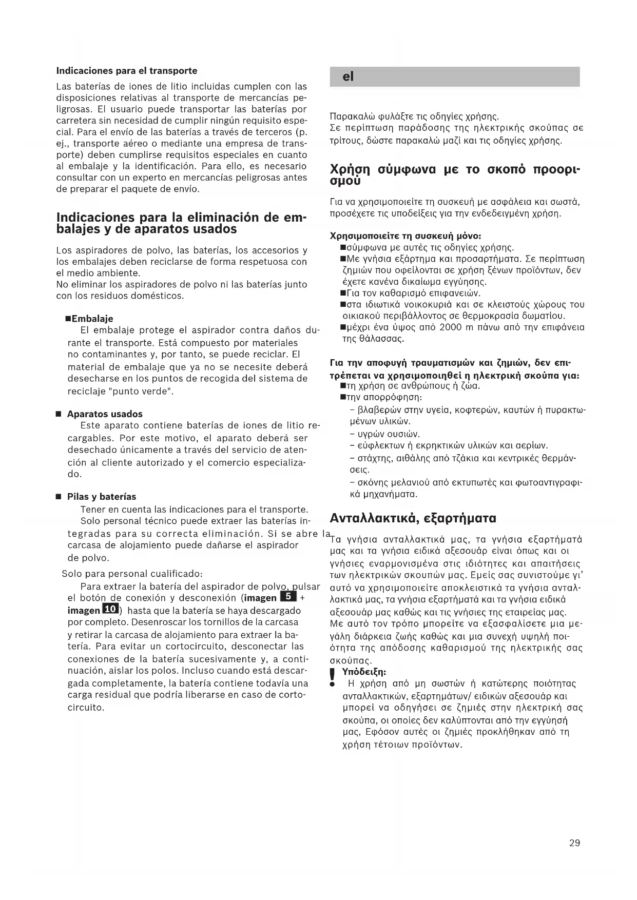 Η συσκευασία προστατεύει την ηλεκτρική σκούπα από ζημιά κατά τη μεταφορά. Αποτελείται από φιλι- κά προς το περιβάλλον υλικά και γι' αυτό είναι ανα- κυκλώσιμη. Παραδώστε τα υλικά συσκευασίας που δε χρειάζονται άλλο, στα σημεία συγκέντρωσης των υλικών ανακύκλωσης. Παλιά συσκευή Αυτή η συσκευή περιλαμβάνει επαναφορτιζόμενες μπαταρίες ιόντων λιθίου. Γι’ αυτό η απόσυρση της συσκευή επιτρέπεται μόνο μέσω των εξουσιοδοτη- μένων κέντρων εξυπηρέτησης πελατών και των ειδι- κών καταστημάτων. Επαναφορτιζόμενες μπαταρίες / μπαταρίες Προσέξτε παρακαλώ τις υποδείξεις για τη μεταφο-