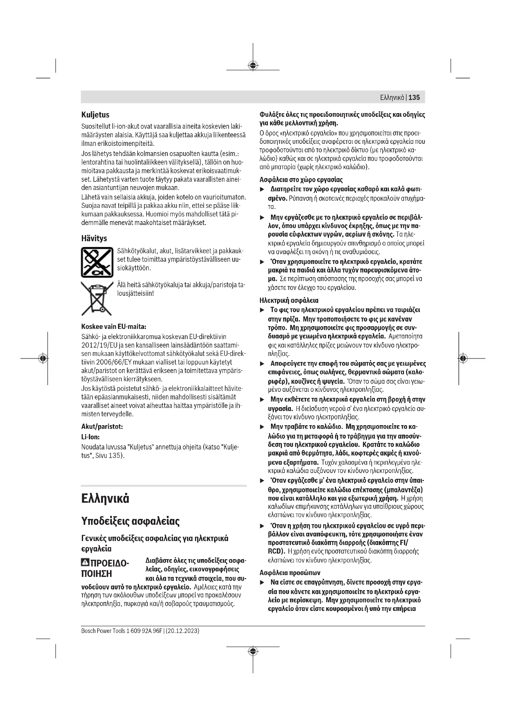 u Χρησιμοποιείτε τα ηλεκτρικά εργαλεία μόνο με τις ειδι- κά σχεδιασμένες μπαταρίες. Η χρήση άλλων μπαταριών μπορεί να οδηγήσει σε τραυματισμούς και να δημιουργήσει κίνδυνο πυρκαγιάς. u Όταν η μπαταρία δε χρησιμοποιείται, κρατήστε την μα- κριά από άλλα μεταλλικά αντικείμενα, όπως συνδετή- ρες χαρτιών, νομίσματα, κλειδιά, καρφιά, βίδες ή άλλα μικρά μεταλλικά αντικείμενα που μπορούν να βραχυκυ- κλώσουν τις επαφές της μπαταρίας. Ένα βραχυκύκλωμα των επαφών της μπαταρίας μπορεί να προκαλέσει τραυματι- σμούς ή φωτιά. u Μια τυχόν εσφαλμένη χρήση μπορεί να οδηγήσει σε διαρροή υγρών από την μπαταρία. Αποφεύγετε κάθε επαφή μ’ αυτά. Σε περίπτωση τυχαίας επαφής ξεπλύνε- τε καλά με νερό. Εάν τα υγρά έρθουν σε επαφή με τα μάτια, ζητήστε επιπλέον ιατρική βοήθεια. Διαρρέοντα 1 609 92A 96F | (20.12.2023) Bosch Power ToolsΕλληνικά | 137 υγρά μπαταρίας μπορεί να οδηγήσουν σε ερεθισμούς του δέρματος ή σε εγκαύματα. u Μην χρησιμοποιείτε μπαταρία ή εργαλείο που είναι κα- τεστραμμένο ή τροποποιημένο. Οι χαλασμένες ή τροπο- ποιημένες μπαταρίες μπορεί να παρουσιάσουν μια απρόβλεπτη συμπεριφορά και να οδηγήσουν σε φωτιά, έκρηξη ή σε κίνδυνο τραυματισμού. u Μην εκθέτετε μια μπαταρία ή ένα εργαλείο μπαταρίας σε φωτιά ή σε πολύ υψηλές θερμοκρασίες. Η έκθεση στη φωτιά ή σε θερμοκρασία πάνω από τους 130 °C μπορεί να προκαλέσει έκρηξη. u Τηρείτε όλες τις υποδείξεις για τη φόρτιση και μη φορ- τίζετε την μπαταρία ή το εργαλείο μπαταρίας ποτέ εκτός της περιοχής θερμοκρασίας που αναφέρεται στις οδηγίες λειτουργίας. Η λάθος φόρτιση ή η φόρτιση εκτός της επιτρεπτής περιοχής θερμοκρασίας μπορεί να κατα- στρέψει την μπαταρία και να αυξήσει τον κίνδυνο πυρκα-