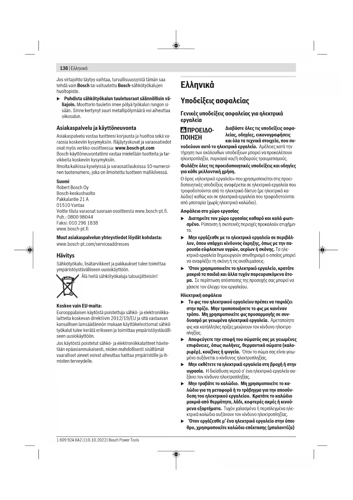 Μια τυχόν αναγκαία αντικατάσταση του ηλεκτρικού καλωδίου πρέπει να διεξαχθεί από τη Bosch ή από ένα εξουσιοδοτημένο κέντρο σέρβις για ηλεκτρικά εργαλεία της Bosch, για να απο- φευχθεί έτσι κάθε κίνδυνος της ασφάλειας. 1 609 92A 6A2 | (10.10.2022) Bosch Power ToolsTürkçe | 149 u Καθαρίζετε τακτικά τις σχισμές αερισμού του ηλεκτρι- κού εργαλείου σας. Η φτερωτή του κινητήρα τραβάει σκόνη μέσα στο περίβλημα και η συσσώρευση μεταλλικής σκόνης μπορεί να προκαλέσει ηλεκτρικούς κινδύνους. Εξυπηρέτηση πελατών και συμβουλές εφαρμογής Η υπηρεσία εξυπηρέτησης πελατών απαντά στις ερωτήσεις σας σχετικά με την επισκευή και τη συντήρηση του προϊόντος σας καθώς και για τα αντίστοιχα ανταλλακτικά. Σχέδια συναρμο- λόγησης και πληροφορίες για τα ανταλλακτικα θα βρείτε επί- σης κάτω από: www.bosch‑pt.com Η ομάδα παροχής συμβουλών της Bosch απαντά ευχαρίστως τις ερωτήσεις σας για τα προϊόντα μας και τα εξαρτήματά τους. Δώστε σε όλες τις ερωτήσεις και παραγγελίες ανταλλακτικών οπωσδήποτε το 10ψήφιο κωδικό αριθμό σύμφωνα με την πι- νακίδα τύπου του προϊόντος.