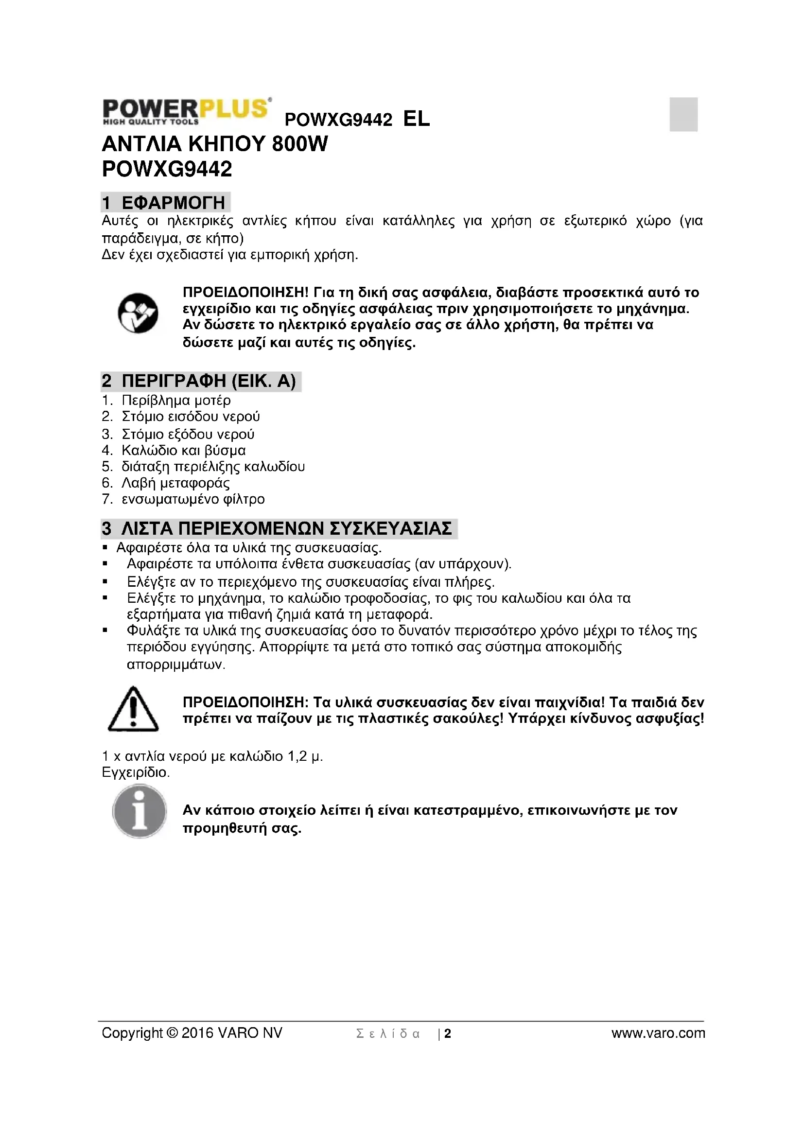 - 14 ΔΗΛΩΣΗ ΣΥΜΜΟΡΦΩΣΗΣ POWXG9442 EL Copyright © 2016 VARO NV Σ ε λ ί δ α | 2 www.varo.com ΑΝΤΛΙΑ ΚΗΠΟΥ 800W POWXG9442 1 ΕΦΑΡΜΟΓΗ Αυτές οι ηλεκτρικές αντλίες κήπου είναι κατάλληλες για χρήση σε εξωτερικό χώρο (για παράδειγμα, σε κήπο) Δεν έχει σχεδιαστεί για εμπορική χρήση. ΠΡΟΕΙΔΟΠΟΙΗΣΗ! Για τη δική σας ασφάλεια, διαβάστε προσεκτικά αυτό το εγχειρίδιο και τις οδηγίες ασφάλειας πριν χρησιμοποιήσετε το μηχάνημα. Αν δώσετε το ηλεκτρικό εργαλείο σας σε άλλο χρήστη, θα πρέπει να δώσετε μαζί και αυτές τις οδηγίες. 2 ΠΕΡΙΓΡΑΦΗ (ΕΙΚ. A) p. 9
