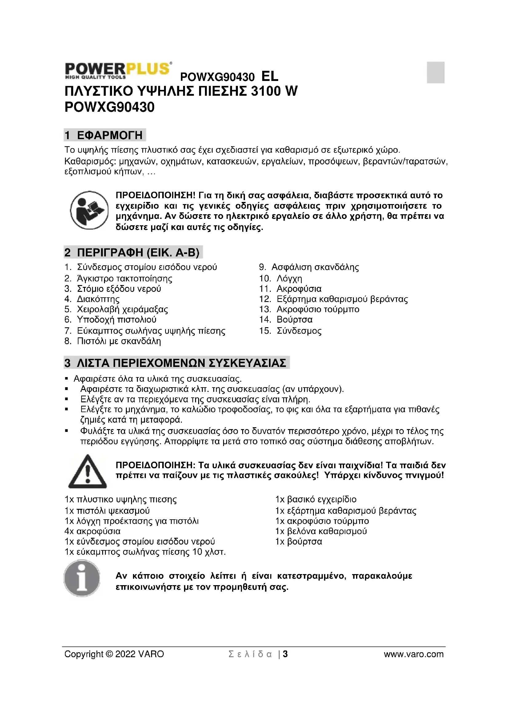- 16 ΔΗΛΩΣΗ ΣΥΜΜΟΡΦΩΣΗΣ POWXG90430 EL Copyright © 2022 VARO Σ ε λ ί δ α | 3 www.varo.com ΠΛΥΣΤΙΚΟ ΥΨΗΛΗΣ ΠΙΕΣΗΣ 3100 W POWXG90430 1 ΕΦΑΡΜΟΓΗ Το υψηλής πίεσης πλυστικό σας έχει σχεδιαστεί για καθαρισμό σε εξωτερικό χώρο. Καθαρισμός: μηχανών, οχημάτων, κατασκευών, εργαλείων, προσόψεων, βεραντών/ταρατσών, εξοπλισμού κήπων, … ΠΡΟΕΙΔΟΠΟΙΗΣΗ! Για τη δική σας ασφάλεια, διαβάστε προσεκτικά αυτό το εγχειρίδιο και τις γενικές οδηγίες ασφάλειας πριν χρησιμοποιήσετε το μηχάνημα. Αν δώσετε το ηλεκτρικό εργαλείο σε άλλο χρήστη, θα πρέπει να δώσετε μαζί και αυτές τις οδηγίες. 2 ΠΕΡΙΓΡΑΦΗ (ΕΙΚ. A-B) p. 14