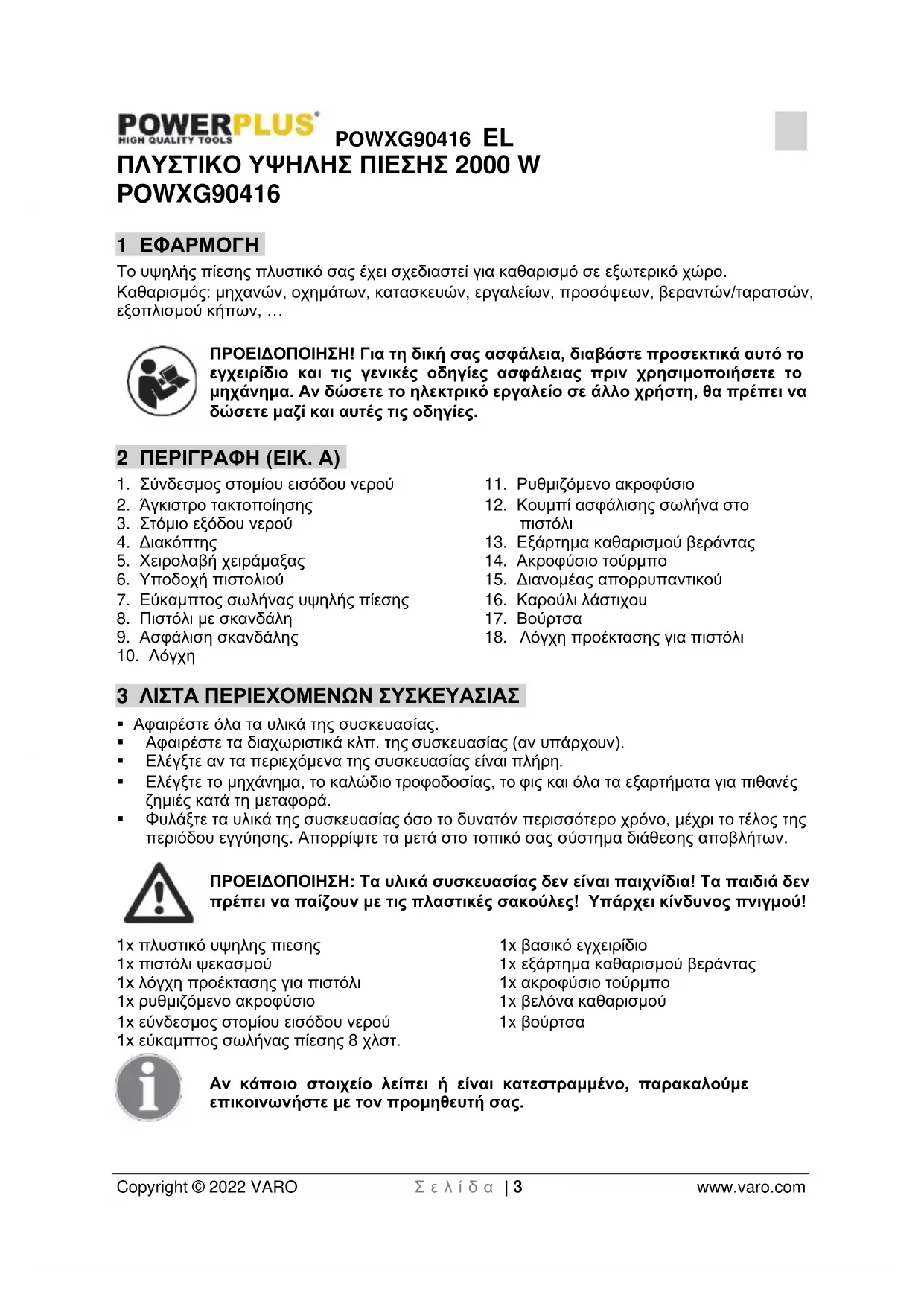 - 16 ΔΗΛΩΣΗ ΣΥΜΜΟΡΦΩΣΗΣ POWXG90416 EL Copyright © 2022 VARO Σ ε λ ί δ α | 3 www.varo.com ΠΛΥΣΤΙΚΟ ΥΨΗΛΗΣ ΠΙΕΣΗΣ 2000 W POWXG90416 1 ΕΦΑΡΜΟΓΗ Το υψηλής πίεσης πλυστικό σας έχει σχεδιαστεί για καθαρισμό σε εξωτερικό χώρο. Καθαρισμός: μηχανών, οχημάτων, κατασκευών, εργαλείων, προσόψεων, βεραντών/ταρατσών, εξοπλισμού κήπων, … ΠΡΟΕΙΔΟΠΟΙΗΣΗ! Για τη δική σας ασφάλεια, διαβάστε προσεκτικά αυτό το εγχειρίδιο και τις γενικές οδηγίες ασφάλειας πριν χρησιμοποιήσετε το μηχάνημα. Αν δώσετε το ηλεκτρικό εργαλείο σε άλλο χρήστη, θα πρέπει να δώσετε μαζί και αυτές τις οδηγίες. 2 ΠΕΡΙΓΡΑΦΗ (ΕΙΚ. A) p. 14