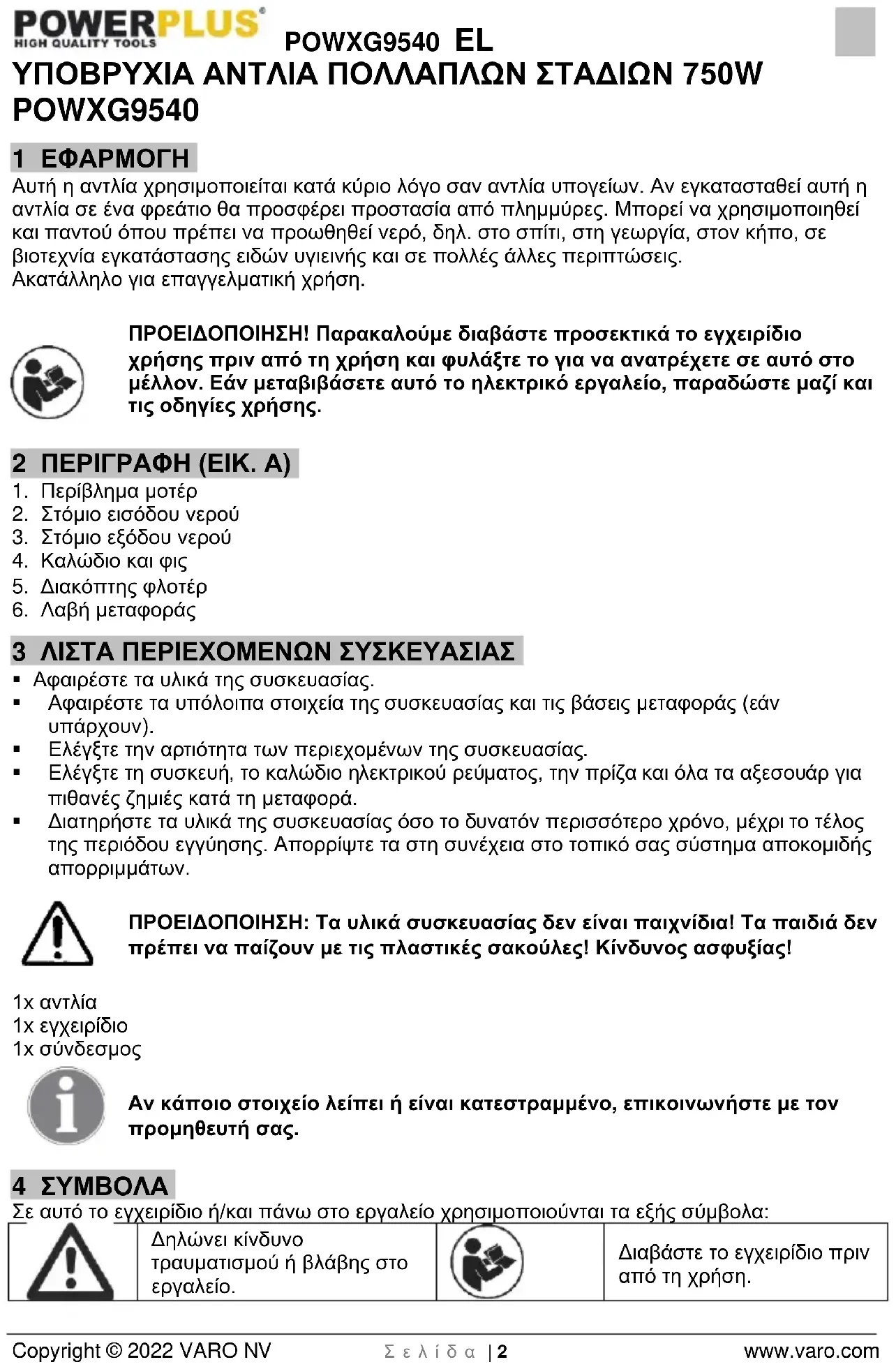 - 19 ΔΗΛΩΣΗ ΣΥΜΜΟΡΦΩΣΗΣ POWXG9540 EL Copyright © 2022 VARO NV Σ ε λ ί δ α | 2 www.varo.com ΥΠΟΒΡΥΧΙΑ ΑΝΤΛΙΑ ΠΟΛΛΑΠΛΩΝ ΣΤΑΔΙΩΝ 750W POWXG9540 1 ΕΦΑΡΜΟΓΗ Αυτή η αντλία χρησιμοποιείται κατά κύριο λόγο σαν αντλία υπογείων. Αν εγκατασταθεί αυτή η αντλία σε ένα φρεάτιο θα προσφέρει προστασία από πλημμύρες. Μπορεί να χρησιμοποιηθεί και παντού όπου πρέπει να προωθηθεί νερό, δηλ. στο σπίτι, στη γεωργία, στον κήπο, σε βιοτεχνία εγκατάστασης ειδών υγιεινής και σε πολλές άλλες περιπτώσεις. Ακατάλληλο για επαγγελματική χρήση. ΠΡΟΕΙΔΟΠΟΙΗΣΗ! Παρακαλούμε διαβάστε προσεκτικά το εγχειρίδιο χρήσης πριν από τη χρήση και φυλάξτε το για να ανατρέχετε σε αυτό στο μέλλον. Εάν μεταβιβάσετε αυτό το ηλεκτρικό εργαλείο, παραδώστε μαζί και τις οδηγίες χρήσης. 2 ΠΕΡΙΓΡΑΦΗ (ΕΙΚ. A) p. 8