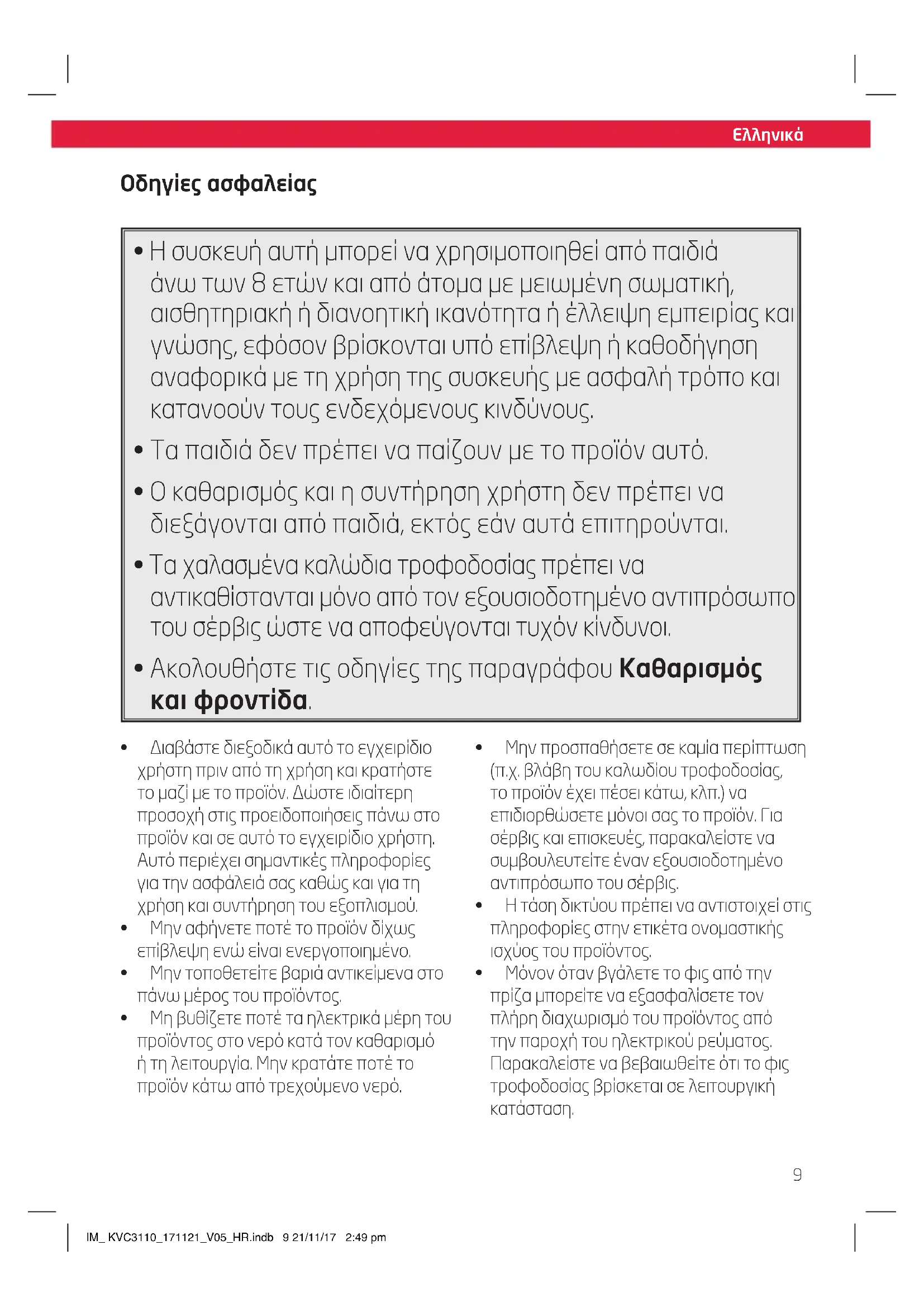 - Μην προσπαθείτε να καθαρίσετε ανθρώπους ή ζώα με τη συσκευή IM_ KVC3110_171121_V05_HR.indb 10 21/11/17 2:49 pm11