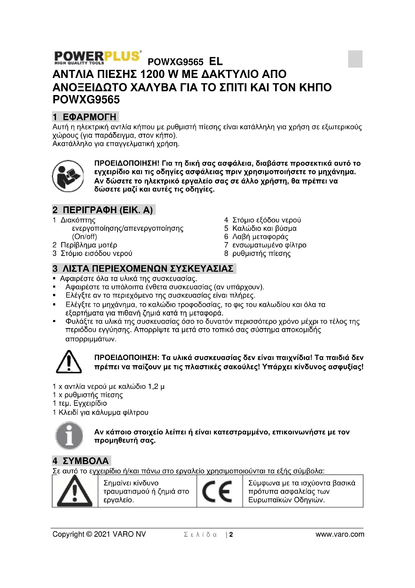 - 14 ΔΗΛΩΣΗ ΣΥΜΜΟΡΦΩΣΗΣ POWXG9565 EL Copyright © 2021 VARO NV Σ ε λ ί δ α | 2 www.varo.com ΑΝΤΛΙΑ ΠΙΕΣΗΣ 1200 W ΜΕ ΔΑΚΤΥΛΙΟ ΑΠΟ ΑΝΟΞΕΙΔΩΤΟ ΧΑΛΥΒΑ ΓΙΑ ΤΟ ΣΠΙΤΙ ΚΑΙ ΤΟΝ ΚΗΠΟ POWXG9565 1 ΕΦΑΡΜΟΓΗ Αυτή η ηλεκτρική αντλία κήπου με ρυθμιστή πίεσης είναι κατάλληλη για χρήση σε εξωτερικούς χώρους (για παράδειγμα, στον κήπο). Ακατάλληλο για επαγγελματική χρήση. ΠΡΟΕΙΔΟΠΟΙΗΣΗ! Για τη δική σας ασφάλεια, διαβάστε προσεκτικά αυτό το εγχειρίδιο και τις οδηγίες ασφάλειας πριν χρησιμοποιήσετε το μηχάνημα. Αν δώσετε το ηλεκτρικό εργαλείο σας σε άλλο χρήστη, θα πρέπει να δώσετε μαζί και αυτές τις οδηγίες. 2 ΠΕΡΙΓΡΑΦΗ (ΕΙΚ. A) 1 Διακόπτης ενεργοποίησης/απενεργοποίησης (On/off) 2 Περίβλημα μοτέρ 3 Στόμιο εισόδου νερού 4 Στόμιο εξόδου νερού 5 Καλώδιο και βύσμα 6 Λαβή μεταφοράς 7 ενσωματωμένο φίλτρο 8 ρυθμιστής πίεσης 3 ΛΙΣΤΑ ΠΕΡΙΕΧΟΜΕΝΩΝ ΣΥΣΚΕΥΑΣΙΑΣ p. 9