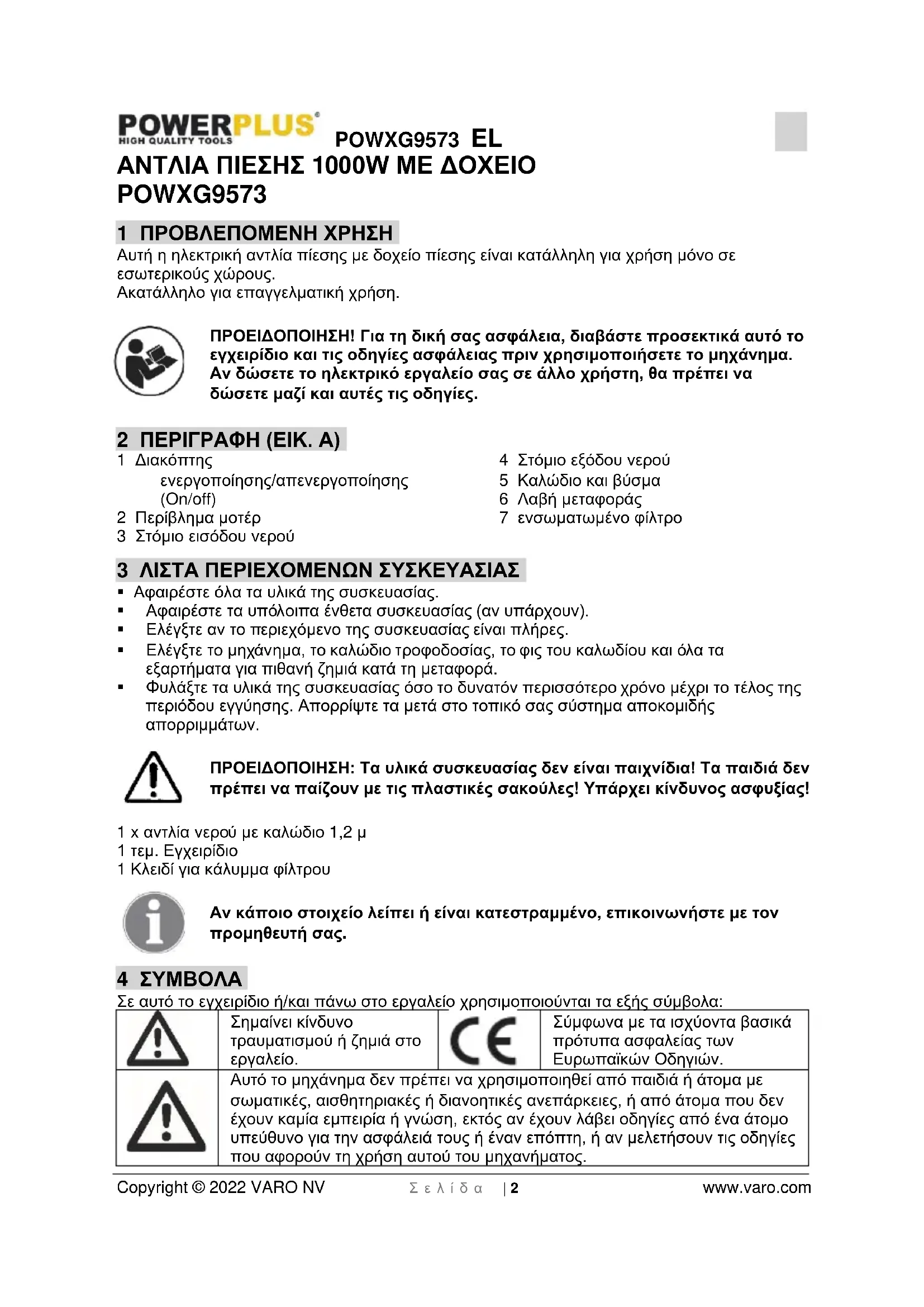 - Η αντλία δεν πρέπει να χρησιμοποιείται σε πισίνες και λίμνες ή άλλα μέρη όπου άτομα θα μπορούν να έρθουν σε επαφή με το νερό.POWXG9573 EL Copyright © 2022 VARO NV Σ ε λ ί δ α | 5 www.varo.com