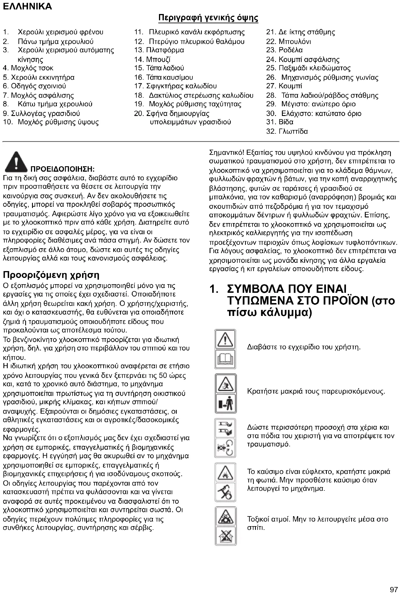 Διαβάστε το εγχειρίδιο του χρήστη. Κρατήστε μακριά τους παρευρισκόμενους. Δώστε περισσότερη προσοχή στα χέρια και στα πόδια του χειριστή για να αποτρέψετε τον τραυματισμό. Το καύσιμο είναι εύφλεκτο, κρατήστε μακριά τη φωτιά. Μην προσθέστε καύσιμο όταν λειτουργεί το μηχάνημα. Τοξικοί ατμοί. Μην το λειτουργείτε μέσα στο σπίτι.98