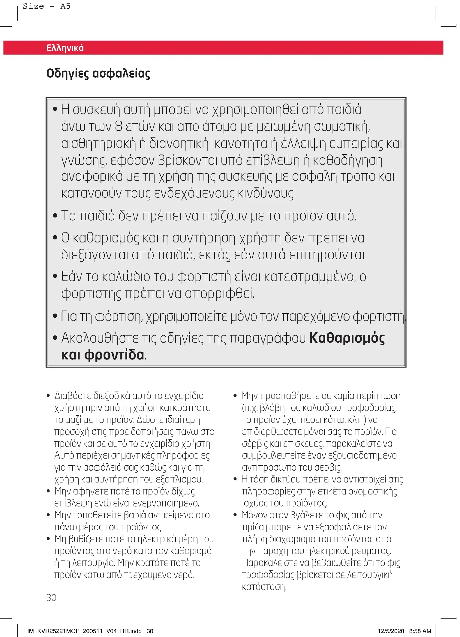 - Όταν καθαρίζετε, μη χρησιμοποιείτε ποτέ διαλύτες ή διαβρωτικά υλικά, σκληρές βούρτσες, μεταλλικά ή αιχμηρά αντικείμενα. Οι διαλύτες είναι επιβλαβείς για την ανθρώπινη υγεία και μπορούν να προσβάλλουν τα πλαστικά μέρη, ενώ οι μηχανισμοί διαβρωτικού καθαρισμού και τα εργαλεία μπορεί να χαράξουν την(τις) επιφάνεια(-ες). IM_KVR25221MOP_200511_V04_HR.indb 34IM_KVR25221MOP_200511_V04_HR.indb 34 12/5/2020 8:58 AM12/5/2020 8:58 AM35