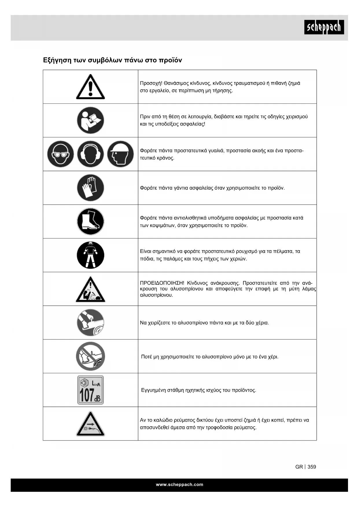 Εξήγηση των συμβόλων πάνω στο προϊόν Προσοχή! Θανάσιμος κίνδυνος, κίνδυνος τραυματισμού ή πιθανή ζημιά στο εργαλείο, σε περίπτωση μη τήρησης. Πριν από τη θέση σε λειτουργία, διαβάστε και τηρείτε τις οδηγίες χειρισμού και τις υποδείξεις ασφαλείας! Φοράτε πάντα προστατευτικά γυαλιά, προστασία ακοής και ένα προστα- τευτικό κράνος. Φοράτε πάντα γάντια ασφαλείας όταν χρησιμοποιείτε το προϊόν. Φοράτε πάντα αντιολισθητικά υποδήματα ασφαλείας με προστασία κατά των κοψιμάτων, όταν χρησιμοποιείτε το προϊόν. Είναι σημαντικό να φοράτε προστατευτικό ρουχισμό για τα πέλματα, τα πόδια, τις παλάμες και τους πήχεις των χεριών. ΠΡΟΕΙΔΟΠΟΙΗΣΗ! Κίνδυνος ανάκρουσης. Προστατευτείτε από την ανά- κρουση του αλυσοπρίονου και αποφεύγετε την επαφή με τη μύτη λάμας αλυσοπρίονου. Να χειρίζεστε το αλυσοπρίονο πάντα και με τα δύο χέρια. Ποτέ μη χρησιμοποιείτε το αλυσοπρίονο μόνο με το ένα χέρι. Εγγυημένη στάθμη ηχητικής ισχύος του προϊόντος. Αν το καλώδιο ρεύματος δικτύου έχει υποστεί ζημιά ή έχει κοπεί, πρέπει να αποσυνδεθεί άμεσα από την τροφοδοσία ρεύματος.www.scheppach.com
