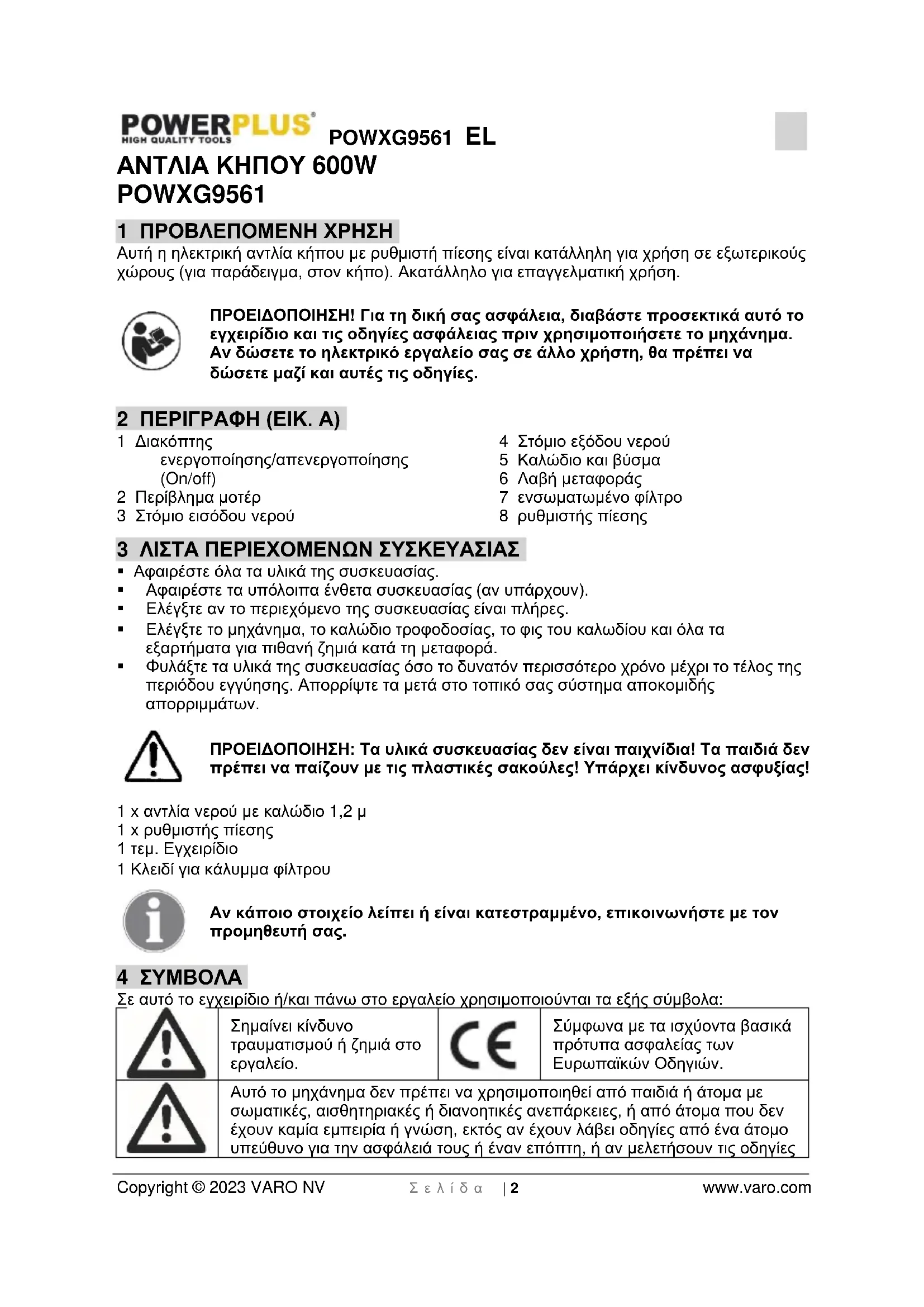 - 14 ΔΗΛΩΣΗ ΣΥΜΜΟΡΦΩΣΗΣ POWXG9561 EL Copyright © 2023 VARO NV Σ ε λ ί δ α | 2 www.varo.com ΑΝΤΛΙΑ ΚΗΠΟΥ 600W POWXG9561 1 ΠΡΟΒΛΕΠΟΜΕΝΗ ΧΡΗΣΗ Αυτή η ηλεκτρική αντλία κήπου με ρυθμιστή πίεσης είναι κατάλληλη για χρήση σε εξωτερικούς χώρους (για παράδειγμα, στον κήπο). Ακατάλληλο για επαγγελματική χρήση. ΠΡΟΕΙΔΟΠΟΙΗΣΗ! Για τη δική σας ασφάλεια, διαβάστε προσεκτικά αυτό το εγχειρίδιο και τις οδηγίες ασφάλειας πριν χρησιμοποιήσετε το μηχάνημα. Αν δώσετε το ηλεκτρικό εργαλείο σας σε άλλο χρήστη, θα πρέπει να δώσετε μαζί και αυτές τις οδηγίες. 2 ΠΕΡΙΓΡΑΦΗ (ΕΙΚ. A) 1 Διακόπτης ενεργοποίησης/απενεργοποίησης (On/off) 2 Περίβλημα μοτέρ 3 Στόμιο εισόδου νερού 4 Στόμιο εξόδου νερού 5 Καλώδιο και βύσμα 6 Λαβή μεταφοράς 7 ενσωματωμένο φίλτρο 8 ρυθμιστής πίεσης 3 ΛΙΣΤΑ ΠΕΡΙΕΧΟΜΕΝΩΝ ΣΥΣΚΕΥΑΣΙΑΣ p. 9