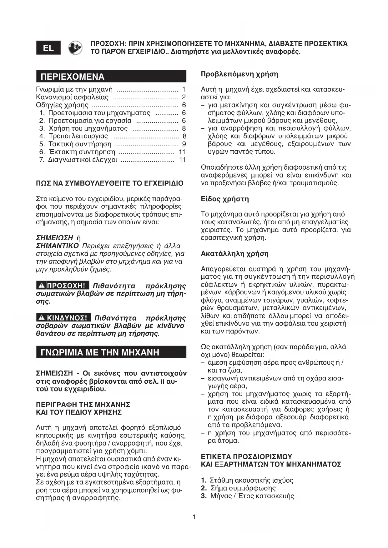 Φορητός φυσητήρας κήπου / Φορητός αναρροφητήρας κήπου ΟΔΗΓΙΕΣ ΧΡΗΣΠΣ ΠΡΟΣΟΧΉ: πριν χρησιμοποιήσετε το μηχάνημα, διαβάστε προσεκτικά το παρόν εγχειρίδιο.