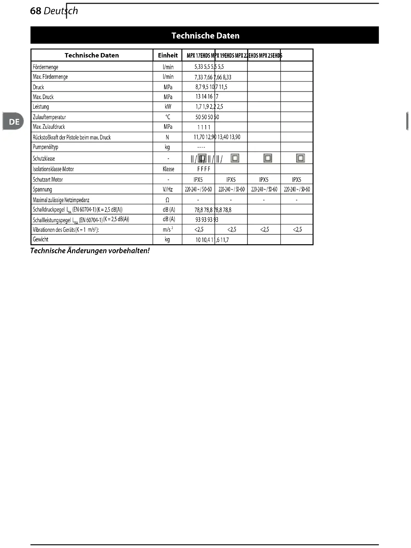 Τεχνικά στοιχείαΜονάδεςMPX 17EHDS MPX 19EHDS MPX 22EHDS MPX 25EHDSΠαροχήl/min5,33 5,5 5,5 5,5Μέγιστη παροχήl/min7,33 7,66 7,66 8,33Πίεση MPa 8,7 9,5 10,7 11,5Μέγιστη πίεση MPa 13 14 16 17Ισχύς