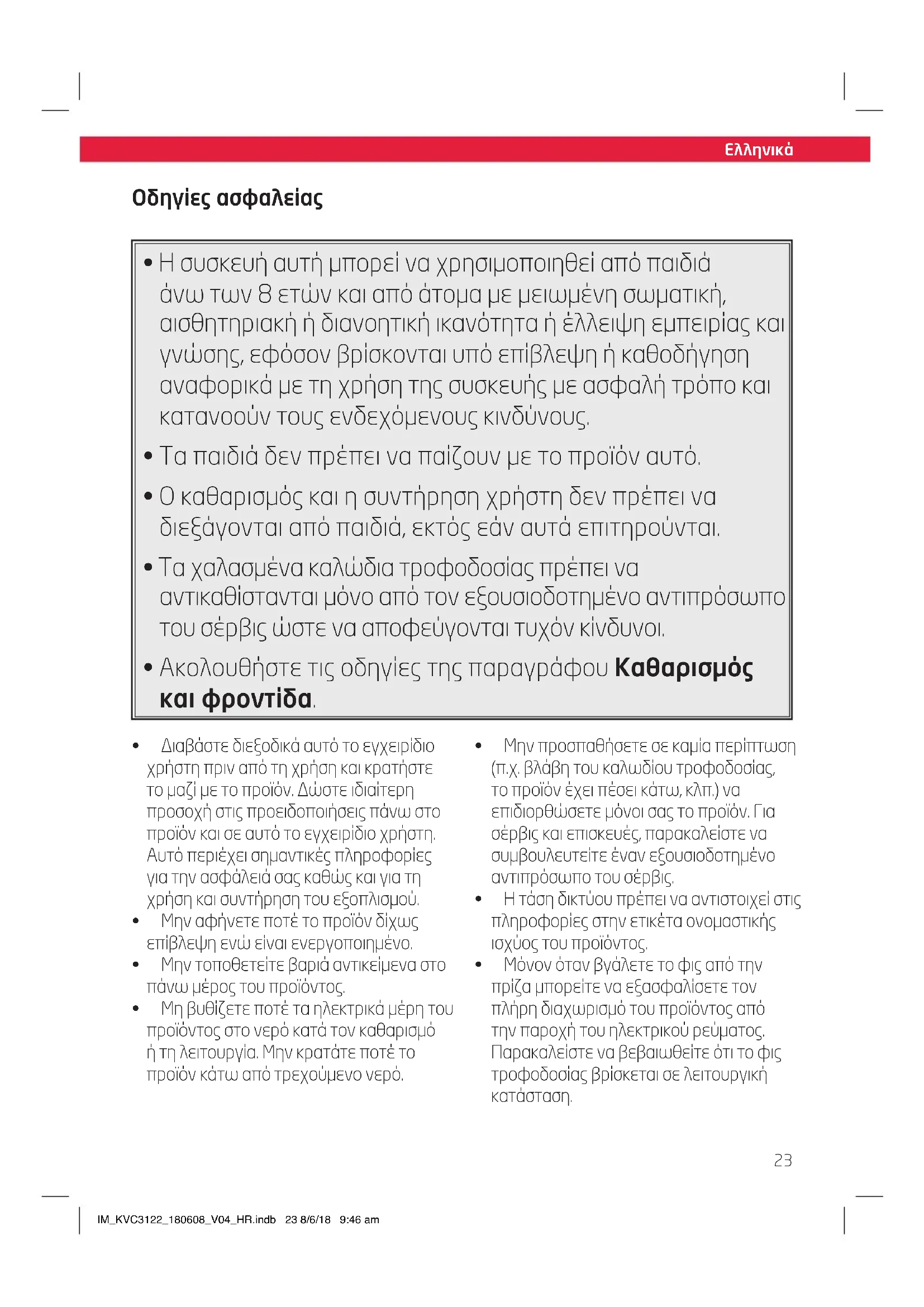 - Εξασφαλίστε ότι το καλώδιο παροχής ρεύματος δεν θα αποτελεί κίνδυνο να σκοντάψετε. IM_KVC3122_180608_V04_HR.indb 24 8/6/18 9:46 am25