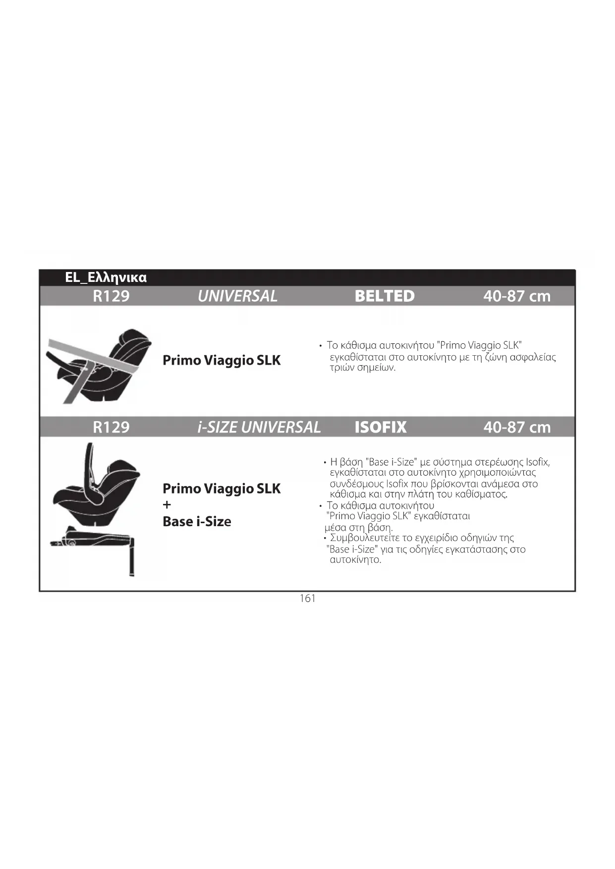 - Συμβουλευτείτε το εγχειρίδιο οδηγιών της "Base i-Size" για τις οδηγίες εγκατάστασης στο αυτοκίνητο. R129 UNIVERSAL BELTED 40-87 cm R129 i-SIZE UNIVERSAL ISOFIX 40-87 cm Primo Viaggio SLK Primo Viaggio SLK