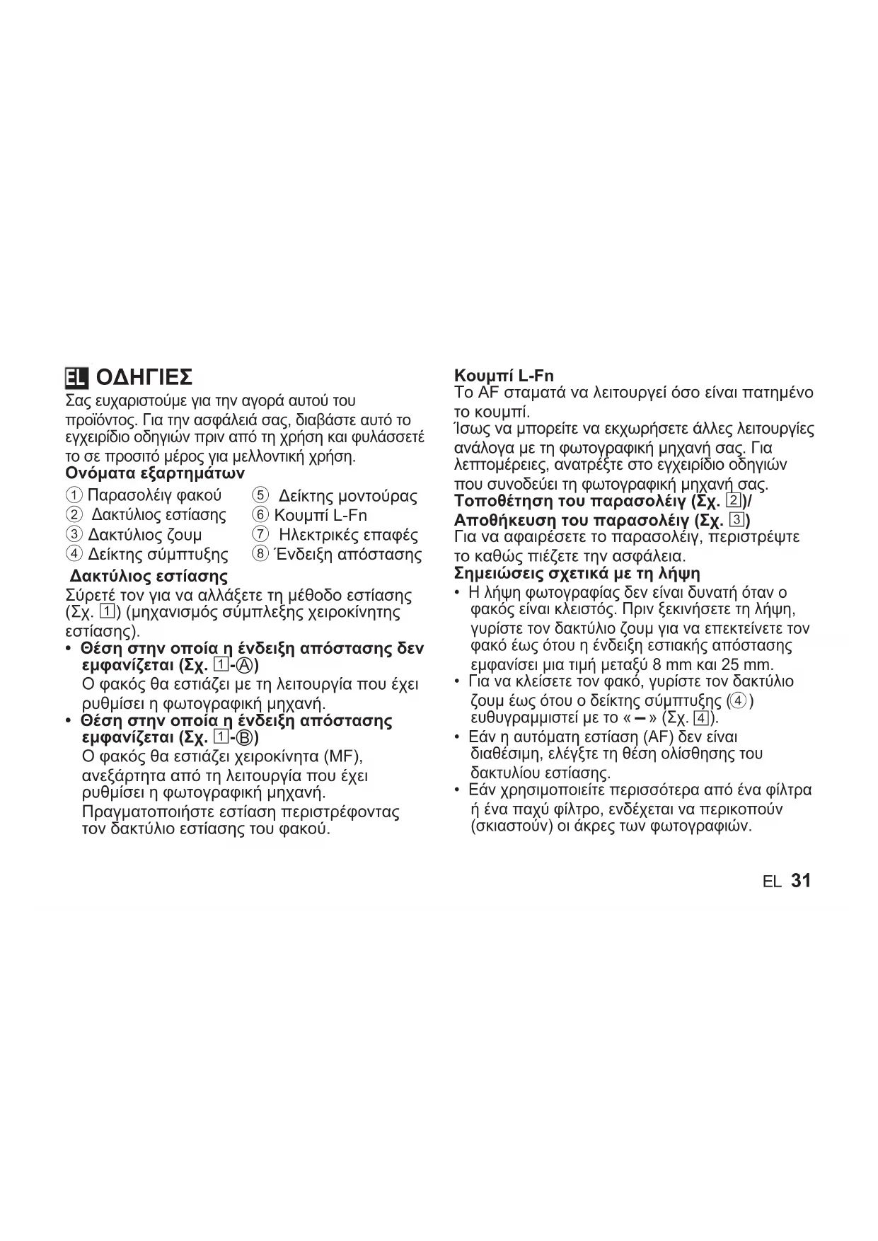 - Εάν χρησιμοποιείτε περισσότερα από ένα φίλτρα ή ένα παχύ φίλτρο, ενδέχεται να περικοπούν (σκιαστούν) οι άκρες των φωτογραφιών. EL32 EL
