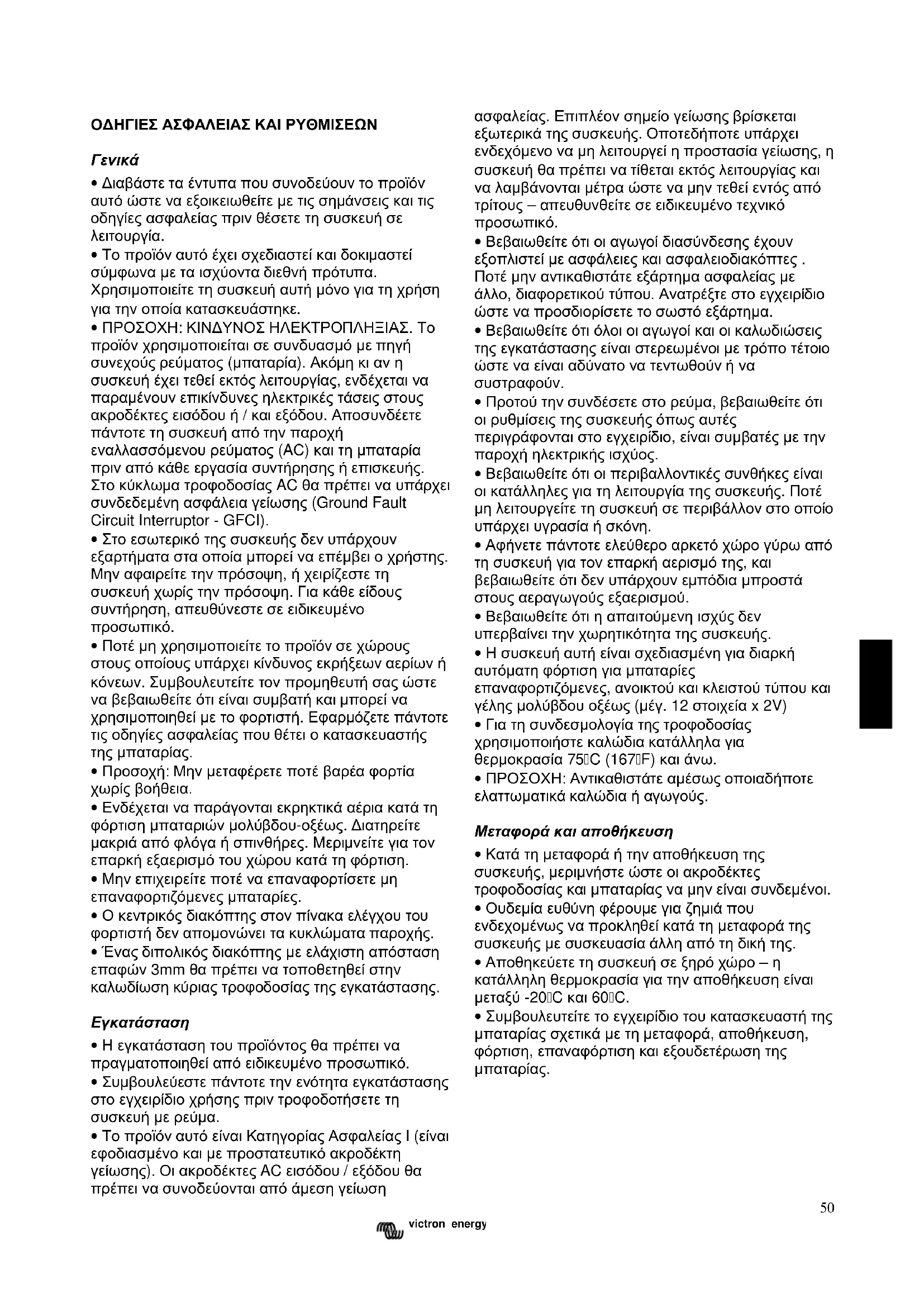 - Συµβουλευτείτε το εγχειρίδιο του κατασκευαστή της µπαταρίας σχετικά µε τη µεταφορά, αποθήκευση, φόρτιση, επαναφόρτιση και εξουδετέρωση της µπαταρίας.51 victron energy