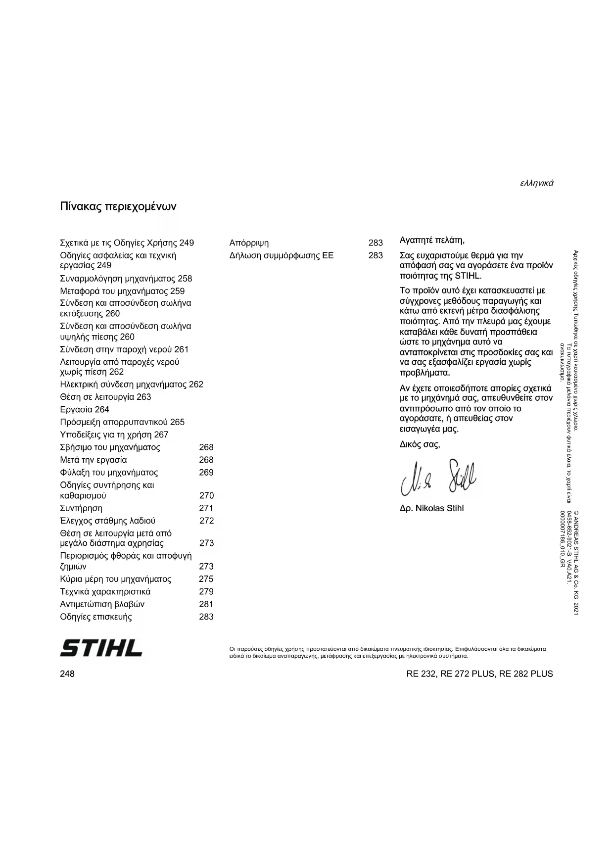 Δρ. Nikolas Stihl Σχετικά με τις Οδηγίες Χρήσης 249 Οδηγίες ασφαλείας και τεχνική εργασίας 249 Συναρμολόγηση μηχανήματος 258 Μεταφορά του μηχανήματος 259 Σύνδεση και αποσύνδεση σωλήνα εκτόξευσης 260 Σύνδεση και αποσύνδεση σωλήνα υψηλής πίεσης 260 Σύνδεση στην παροχή νερού 261 Λειτουργία από παροχές νερού χωρίς πίεση 262 Ηλεκτρική σύνδεση μηχανήματος 262 Θέση σε λειτουργία 263 Εργασία 264 Πρόσμειξη απορρυπαντικού 265 Υποδείξεις για τη χρήση 267 Σβήσιμο του μηχανήματος 268 Μετά την εργασία 268 Φύλαξη του μηχανήματος 269 Οδηγίες συντήρησης και καθαρισμού 270 Συντήρηση 271 Έλεγχος στάθμης λαδιού 272 Θέση σε λειτουργία μετά από μεγάλο διάστημα αχρησίας 273 Περιορισμός φθοράς και αποφυγή ζημιών 273 Κύρια μέρη του μηχανήματος 275 Τεχνικά χαρακτηριστικά 279 Αντιμετώπιση βλαβών 281 Οδηγίες επισκευής 283 Απόρριψη 283 Δήλωση συμμόρφωσης ΕΕ 283RE 232, RE 272 PLUS, RE 282 PLUS