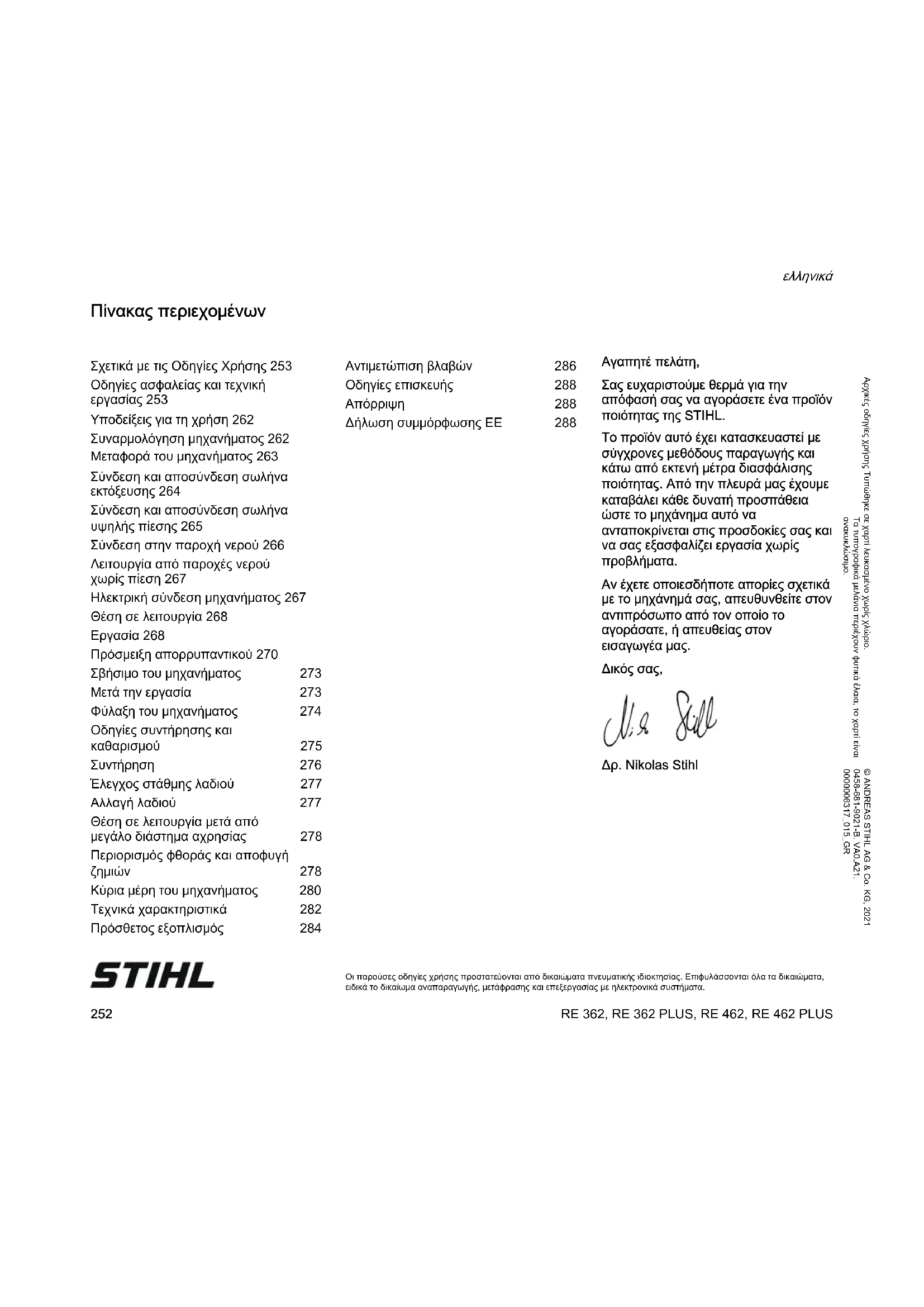 Δρ. Nikolas Stihl Σχετικά με τις Οδηγίες Χρήσης 253 Οδηγίες ασφαλείας και τεχνική εργασίας 253 Υποδείξεις για τη χρήση 262 Συναρμολόγηση μηχανήματος 262 Μεταφορά του μηχανήματος 263 Σύνδεση και αποσύνδεση σωλήνα εκτόξευσης 264 Σύνδεση και αποσύνδεση σωλήνα υψηλής πίεσης 265 Σύνδεση στην παροχή νερού 266 Λειτουργία από παροχές νερού χωρίς πίεση 267 Ηλεκτρική σύνδεση μηχανήματος 267 Θέση σε λειτουργία 268 Εργασία 268 Πρόσμειξη απορρυπαντικού 270 Σβήσιμο του μηχανήματος 273 Μετά την εργασία 273 Φύλαξη του μηχανήματος 274 Οδηγίες συντήρησης και καθαρισμού 275 Συντήρηση 276 Έλεγχος στάθμης λαδιού 277 Αλλαγή λαδιού 277 Θέση σε λειτουργία μετά από μεγάλο διάστημα αχρησίας 278 Περιορισμός φθοράς και αποφυγή ζημιών 278 Κύρια μέρη του μηχανήματος 280 Τεχνικά χαρακτηριστικά 282 Πρόσθετος εξοπλισμός 284 Αντιμετώπιση βλαβών 286 Οδηγίες επισκευής 288 Απόρριψη 288 Δήλωση συμμόρφωσης ΕΕ 288RE 362, RE 362 PLUS, RE 462, RE 462 PLUS
