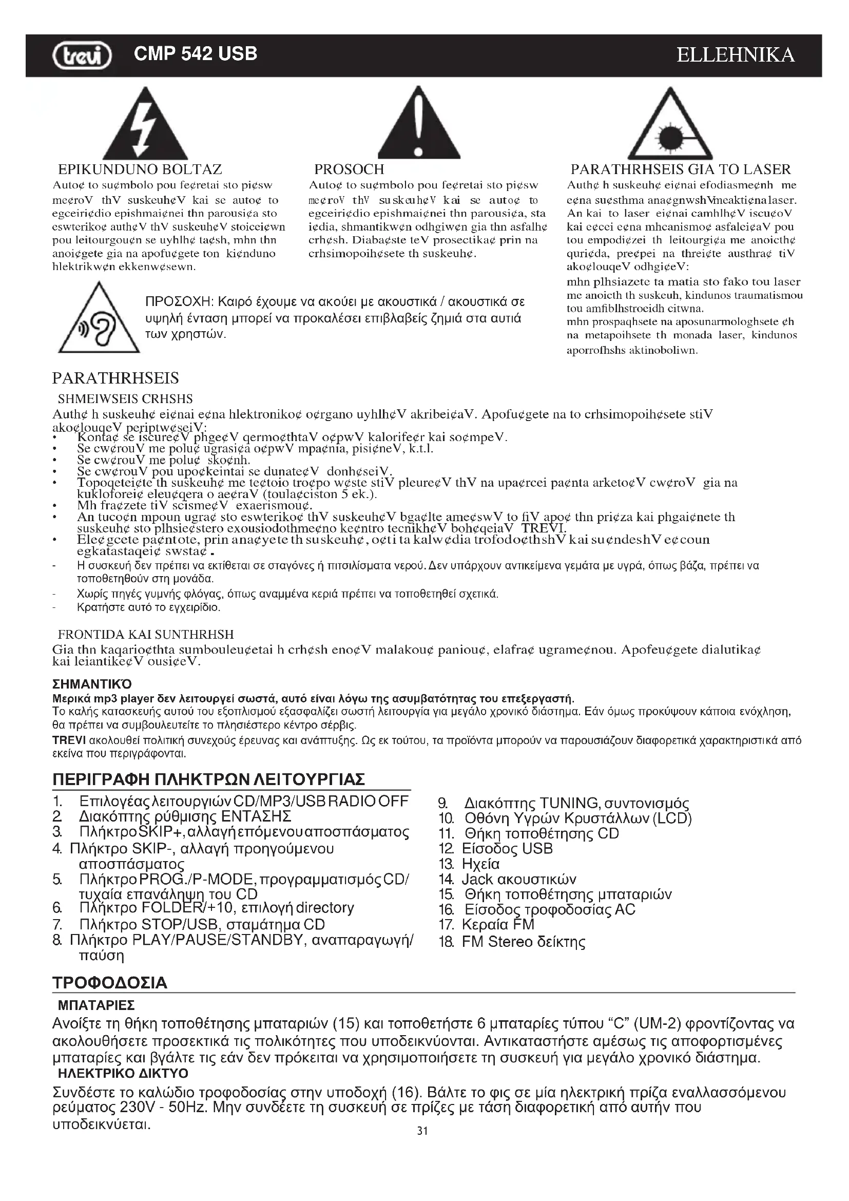 Κατεβάστε τις οδηγίες για το Cd player/καταγραφέας σε μορφή PDF δωρεάν! Βρείτε το εγχειρίδιό σας CMP 542 USB - Trevi και πάρτε ξανά την ηλεκτρονική σας συσκευή στα χέρια σας. Σε αυτή τη σελίδα δημοσιεύονται όλα τα έγγραφα που απαιτούνται για τη χρήση της συσκευής σας. CMP 542 USB της μάρκας Trevi.