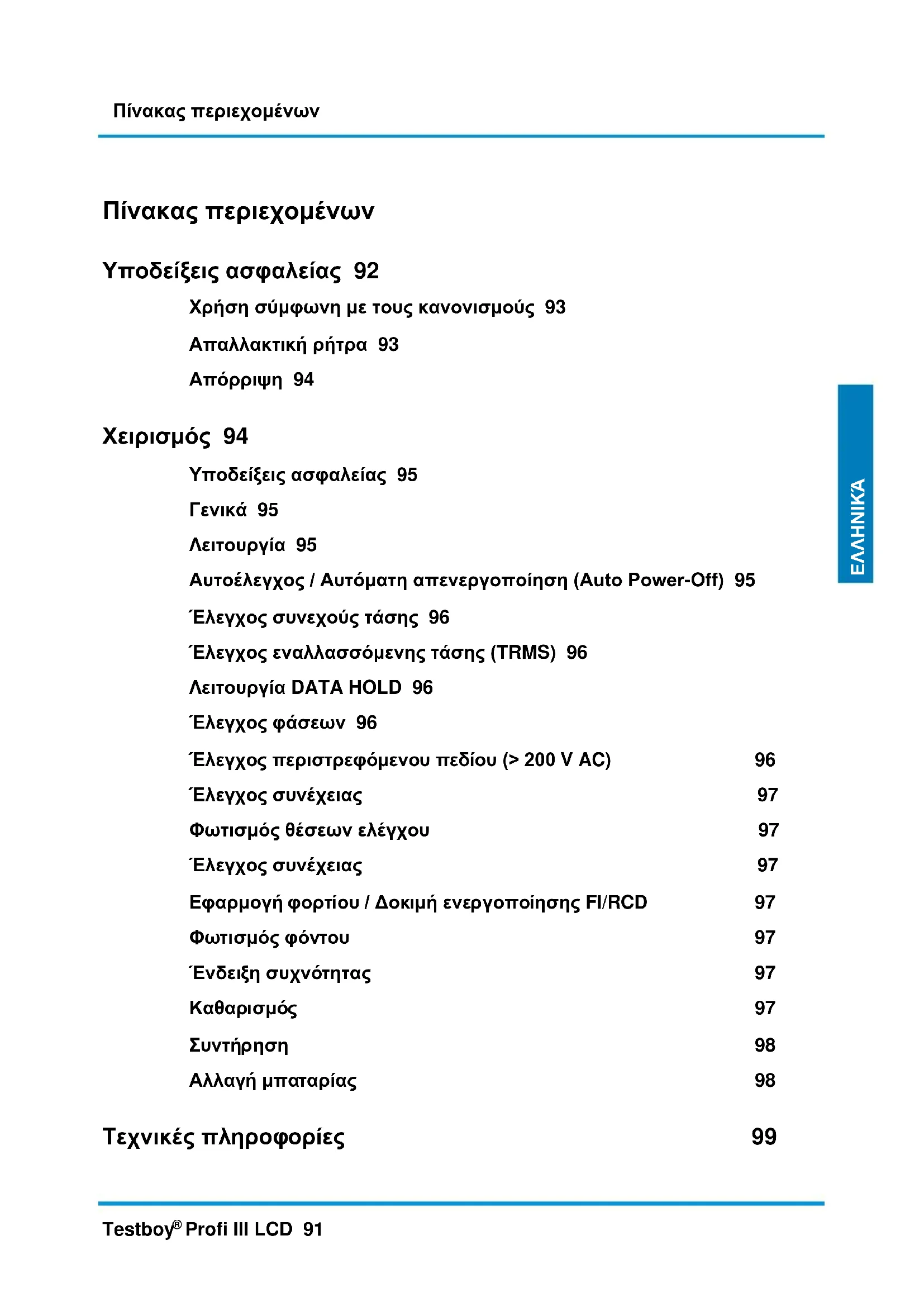 Πίνακας περιεχομένων Υποδείξεις ασφαλείας 92 Χρήση σύμφωνη με τους κανονισμούς 93 Απαλλακτική ρήτρα 93 Απόρριψη 94 Χειρισμός 94 Υποδείξεις ασφαλείας 95 Γενικά 95 Λειτουργία 95 Αυτοέλεγχος / Αυτόματη απενεργοποίηση (Auto Power-Off) 95 Έλεγχος συνεχούς τάσης 96 Έλεγχος εναλλασσόμενης τάσης (TRMS) 96 Λειτουργία DATA HOLD 96 Έλεγχος φάσεων 96 Έλεγχος περιστρεφόμενου πεδίου (> 200 V AC) 96 Έλεγχος συνέχειας 97 Φωτισμός θέσεων ελέγχου 97 Έλεγχος συνέχειας 97 Εφαρμογή φορτίου / Δοκιμή ενεργοποίησης FI/RCD 97 Φωτισμός φόντου 97 Ένδειξη συχνότητας 97 Καθαρισμός 97 Συντήρηση 98 Αλλαγή μπαταρίας 98 Τεχνικές πληροφορίες 99Υποδείξεις ασφαλείας 92 Testboy