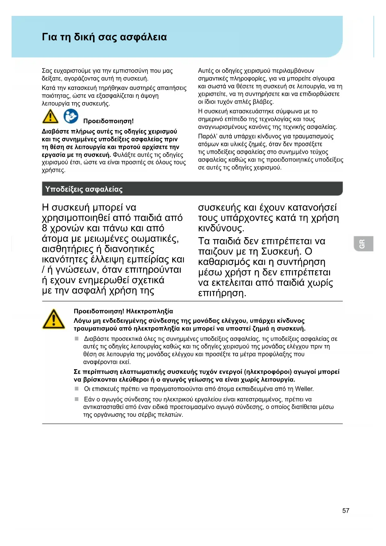 Προειδοποιηση! Ηλεκτροπληξία Λγω μη ενδεδειγμένης σύνδεσης της μονάδας ελέγχου, υπάρχει κίνδυνος τραυματισμού απ ηλεκτροπληξία και μπορεί να υποστεί ζημιά η συσκευή. Διαβάστεπροσεκτικάόλεςτιςσυνημμένεςυποδείξειςασφαλείας,τιςυποδείξειςασφαλείαςσε αυτέςτιςοδηγίεςλειτουργίαςκαθώςκαιτιςοδηγίεςχειρισμούτηςμονάδαςελέγχουπριντη θέσησελειτουργίατηςμονάδαςελέγχουκαιπροσέξτεταμέτραπροφύλαξηςπου αναφέρονταιεκεί. Σε περίπτωση ελαττωματικής συσκευής τυχν ενεργοί (ηλεκτροφροι) αγωγοί μπορεί να βρίσκονται ελεύθεροι ή ο αγωγς γείωσης να είναι χωρίς λειτουργία. ΟιεπισκευέςπρέπειναπραγματοποιούνταιαπόάτομαεκπαιδευμένααπότηWeller. Εάνοαγωγόςσύνδεσηςτουηλεκτρικούεργαλείουείναικατεστραμμένος,πρέπεινα αντικατασταθείαπόένανειδικάπροετοιμασμένοαγωγόσύνδεσης,οοποίοςδιατίθεταιμέσω τηςοργάνωσηςτουσέρβιςπελατών.58