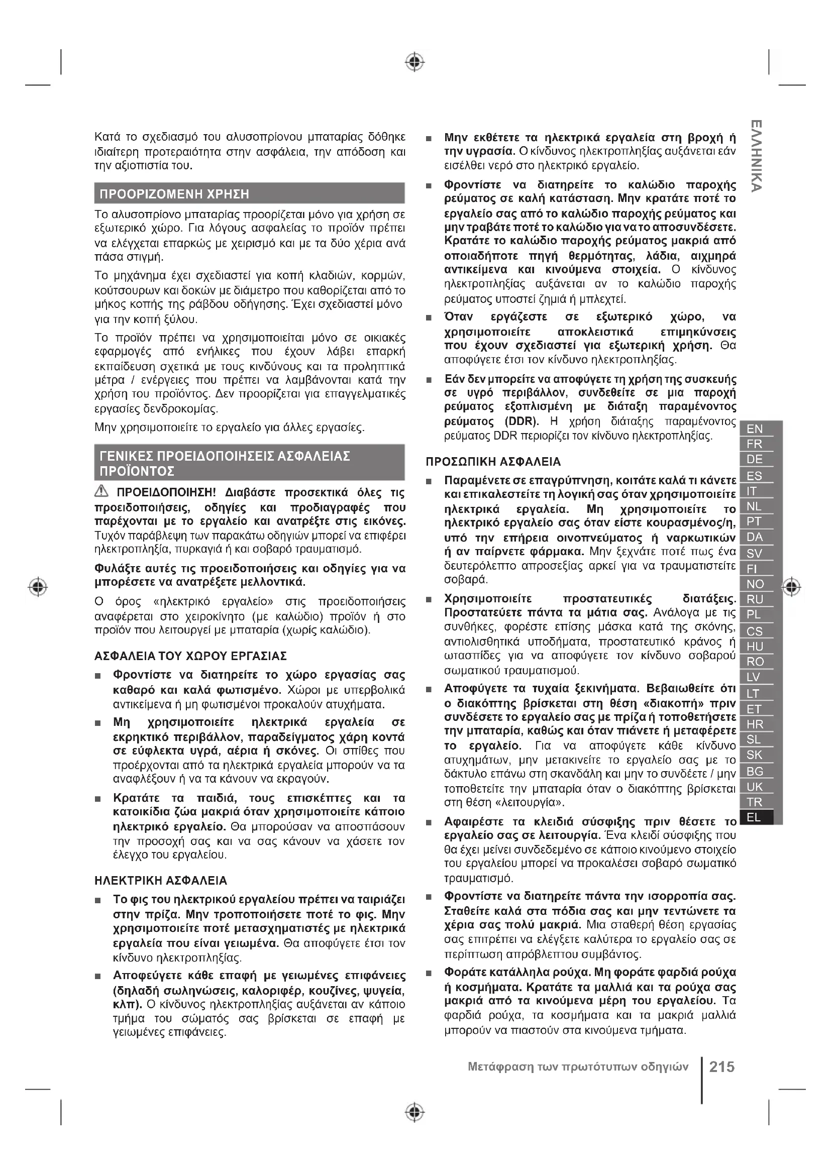 ΠΡΟΕΙΔΟΠΟΙΗΣΗ! Διαβάστε προσεκτικά όλες τις προειδοποιήσεις, οδηγίες και προδιαγραφές που παρέχονται με το εργαλείο και ανατρέξτε στις εικόνες. Τυχόν παράβλεψη των παρακάτω οδηγιών μπορεί να επιφέρει ηλεκτροπληξία, πυρκαγιά ή και σοβαρό τραυματισμό. Φυλάξτε αυτές τις προειδοποιήσεις και οδηγίες για να μπορέσετε να ανατρέξετε μελλοντικά. Ο όρος «ηλεκτρικό εργαλείο» στις προειδοποιήσεις αναφέρεται στο χειροκίνητο (με καλώδιο) προϊόν ή στο προϊόν που λειτουργεί με μπαταρία (χωρίς καλώδιο). ΑΣΦΑΛΕΙΑ ΤΟΥ ΧΩΡΟΥ ΕΡΓΑΣΙΑΣ ■ Φροντίστε να διατηρείτε το χώρο εργασίας σας καθαρό και καλά φωτισμένο. Χώροι με υπερβολικά αντικείμενα ή μη φωτισμένοι προκαλούν ατυχήματα. ■ Μη χρησιμοποιείτε ηλεκτρικά εργαλεία σε εκρηκτικό περιβάλλον, παραδείγματος χάρη κοντά σε εύφλεκτα υγρά, αέρια ή σκόνες. Οι σπίθες που προέρχονται από τα ηλεκτρικά εργαλεία μπορούν να τα αναφλέξουν ή να τα κάνουν να εκραγούν. ■ Κρατάτε τα παιδιά, τους επισκέπτες και τα κατοικίδια ζώα μακριά όταν χρησιμοποιείτε κάποιο ηλεκτρικό εργαλείο. Θα μπορούσαν να αποσπάσουν την προσοχή σας και να σας κάνουν να χάσετε τον έλεγχο του εργαλείου. ΗΛΕΚΤΡΙΚΗ ΑΣΦΑΛΕΙΑ ■ Το φις του ηλεκτρικού εργαλείου πρέπει να ταιριάζει στην πρίζα. Μην τροποποιήσετε ποτέ το φις. Μην χρησιμοποιείτε ποτέ μετασχηματιστές με ηλεκτρικά εργαλεία που είναι γειωμένα. Θα αποφύγετε έτσι τον κίνδυνο ηλεκτροπληξίας. ■ Αποφεύγετε κάθε επαφή με γειωμένες επιφάνειες (δηλαδή σωληνώσεις, καλοριφέρ, κουζίνες, ψυγεία, κλπ). Ο κίνδυνος ηλεκτροπληξίας αυξάνεται αν κάποιο τμήμα του σώματός σας βρίσκεται σε επαφή με γειωμένες επιφάνειες. ■ Μην εκθέτετε τα ηλεκτρικά εργαλεία στη βροχή ή την υγρασία. Ο κίνδυνος ηλεκτροπληξίας αυξάνεται εάν εισέλθει νερό στο ηλεκτρικό εργαλείο. ■ Φροντίστε να διατηρείτε το καλώδιο παροχής ρεύματος σε καλή κατάσταση. Μην κρατάτε ποτέ το εργαλείο σας από το καλώδιο παροχής ρεύματος και μην τραβάτε ποτέ το καλώδιο για να το αποσυνδέσετε. Κρατάτε το καλώδιο παροχής ρεύματος μακριά από οποιαδήποτε πηγή θερμότητας, λάδια, αιχμηρά αντικείμενα και κινούμενα στοιχεία. Ο κίνδυνος ηλεκτροπληξίας αυξάνεται αν το καλώδιο παροχής ρεύματος υποστεί ζημιά ή μπλεχτεί. ■ Όταν εργάζεστε σε εξωτερικό χώρο, να χρησιμοποιείτε αποκλειστικά επιμηκύνσεις που έχουν σχεδιαστεί για εξωτερική χρήση. Θα αποφύγετε έτσι τον κίνδυνο ηλεκτροπληξίας. ■ Εάν δεν μπορείτε να αποφύγετε τη χρήση της συσκευής σε υγρό περιβάλλον, συνδεθείτε σε μια παροχή ρεύματος εξοπλισμένη με διάταξη παραμένοντος ρεύματος (DDR). Η χρήση διάταξης παραμένοντος ρεύματος DDR περιορίζει τον κίνδυνο ηλεκτροπληξίας. ΠΡΟΣΩΠΙΚΗ ΑΣΦΑΛΕΙΑ ■ Παραμένετε σε επαγρύπνηση, κοιτάτε καλά τι κάνετε και επικαλεστείτε τη λογική σας όταν χρησιμοποιείτε ηλεκτρικά εργαλεία. Μη χρησιμοποιείτε το ηλεκτρικό εργαλείο σας όταν είστε κουρασμένος/η, υπό την επήρεια οινοπνεύματος ή ναρκωτικών ή αν παίρνετε φάρμακα. Μην ξεχνάτε ποτέ πως ένα δευτερόλεπτο απροσεξίας αρκεί για να τραυματιστείτε