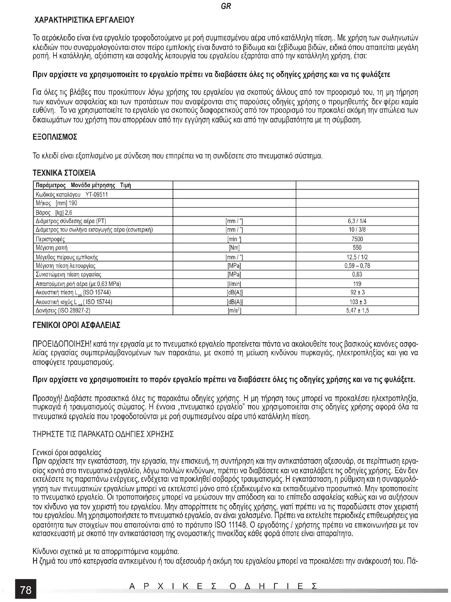 Το κλειδί είναι εξοπλισμένο με σύνδεση που επιτρέπει να τη συνδέσετε στο πνευματικό σύστημα. ΤΕΧΝΙΚΑ ΣΤΟΙΧΕΙΑ Παράμετρος Μονάδα μέτρησης Τιμή Κωδικός καταλόγου YT-09511 Μήκος [mm] 190 Βάρος [kg] 2,6 Διάμετρος σύνδεσης αέρα (PT) [mm / ”] 6,3 / 1/4 Διάμετρος του σωλήνα εισαγωγής αέρα (εσωτερική) [mm / ”] 10 / 3/8 Περιστροφές [min
