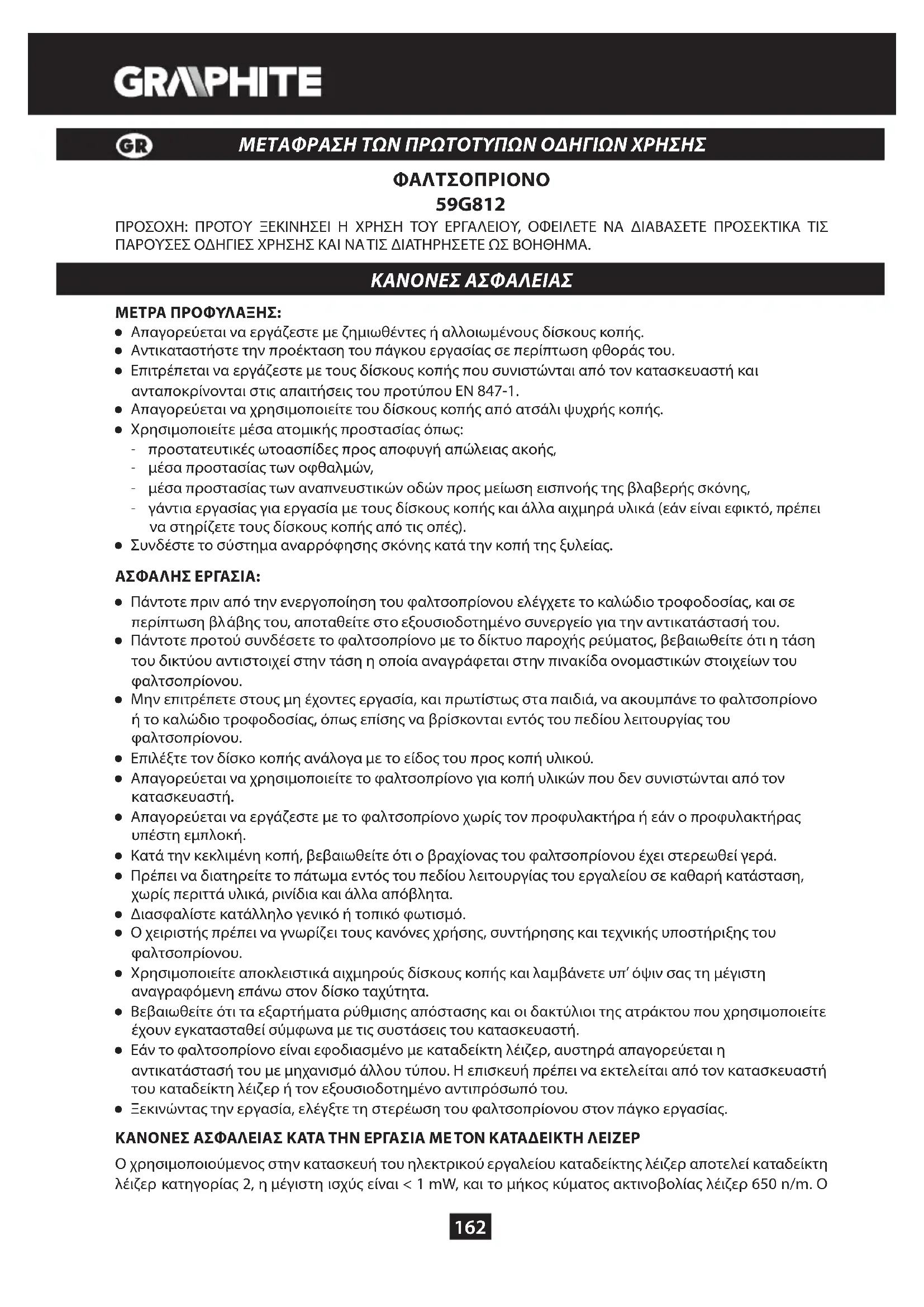 - Zadržava se pravo izmena. „Grupa Topex Spółka z ograniczoną odpowiedzialnością“ Spółka komandytowa sa sedištem u Varšavi, ulica Pograniczna 2/4 (u daljem tekstu: „Grupa Topex“) informiše da, sva autorska prava na sadržaj dole datog uputstva (u daljem tekstu: „Uputstvo“), u kome između ostalog, tekst uputstva, postavljene fotograje, sheme, crteži, a takođe i sastav, pripadaju iskuljučivo Grupa Topex-u i podležu pravnoj zaštiti u skladu sa propisom od dana 4. februara 1994. godine, o autorskim pravima i sličnim pravima (tj. Pravni glasnik 2006 broj 90, član 631, sa kasnijim izmenama). Kopiranje, menjanje, objavljivanje, menjanje u cilju komercijalizacije, celine Uputstva kao i njenih delova, bez saglasnosti Grupa Topex-a u pismenoj formi, strogo je zabranjeno i može dovesti do pozivanja na odgvornost kako građansku tako i sudsku.162 ΜΕΤΑΦΡΑΣΗ ΤΩΝ ΠΡΩΤΟΤΥΠΩΝ ΟΔΗΓΙΩΝ ΧΡΗΣΗΣ ΦΑΛΤΣΟΠΡΙΟΝΟ 59G812 ΠΡΟΣΟΧΗ: ΠΡΟΤΟΥ ΞΕΚΙΝΗΣΕΙ Η ΧΡΗΣΗ ΤΟΥ ΕΡΓΑΛΕΙΟΥ, ΟΦΕΙΛΕΤΕ ΝΑ ΔΙΑΒΑΣΕΤΕ ΠΡΟΣΕΚΤΙΚΑ ΤΙΣ ΠΑΡΟΥΣΕΣ ΟΔΗΓΙΕΣ ΧΡΗΣΗΣ ΚΑΙ ΝΑ ΤΙΣ ΔΙΑΤΗΡΗΣΕΤΕ ΩΣ ΒΟΗΘΗΜΑ. ΚΑΝΟΝΕΣ ΑΣΦΑΛΕΙΑΣ ΜΕΤΡΑ ΠΡΟΦΥΛΑΞΗΣ: Ɣ Απαγορεύεται να εργάζεστε με ζημιωθέντες ή αλλοιωμένους δίσκους κοπής. Ɣ Αντικαταστήστε την προέκταση του πάγκου εργασίας σε περίπτωση φθοράς του. Ɣ Επιτρέπεται να εργάζεστε με τους δίσκους κοπής που συνιστώνται από τον κατασκευαστή και ανταποκρίνονται στις απαιτήσεις του προτύπου EN 847-1. Ɣ Απαγορεύεται να χρησιμοποιείτε του δίσκους κοπής από ατσάλι ψυχρής κοπής. Ɣ Χρησιμοποιείτε μέσα ατομικής προστασίας όπως: - προστατευτικές ωτοασπίδες προς αποφυγή απώλειας ακοής, - μέσα προστασίας των οφθαλμών, - μέσα προστασίας των αναπνευστικών οδών προς μείωση εισπνοής της βλαβερής σκόνης, - γάντια εργασίας για εργασία με τους δίσκους κοπής και άλλα αιχμηρά υλικά (εάν είναι εφικτό, πρέπει να στηρίζετε τους δίσκους κοπής από τις οπές). Ɣ Συνδέστε το σύστημα αναρρόφησης σκόνης κατά την κοπή της ξυλείας. ΑΣΦΑΛΗΣ ΕΡΓΑΣΙΑ: Ɣ Πάντοτε πριν από την ενεργοποίηση του φαλτσοπρίονου ελέγχετε το καλώδιο τροφοδοσίας, και σε περίπτωση βλ άβης του, αποταθείτε στο εξουσιοδοτημένο συνεργείο για την αντικατάστασή του. Ɣ Πάντοτε προτού συνδέσετε το φαλτσοπρίονο με το δίκτυο παροχής ρεύματος, βεβαιωθείτε ότι η τάση του δικτύου αντιστοιχεί στην τάση η οποία αναγράφεται στην πινακίδα ονομαστικών στοιχείων του φαλτσοπρίονου. Ɣ Μην επιτρέπετε στους μη έχοντες εργασία, και πρωτίστως στα παιδιά, να ακουμπάνε το φαλτσοπρίονο ή το καλώδιο τροφοδοσίας, όπως επίσης να βρίσκονται εντός του πεδίου λειτουργίας του φαλτσοπρίονου. Ɣ Επιλέξτε τον δίσκο κοπής ανάλογα με το είδος του προς κοπή υλικού. Ɣ Απαγορεύεται να χρησιμοποιείτε το φαλτσοπρίονο για κοπή υλικών που δεν συνιστώνται από τον κατασκευαστή. Ɣ Απαγορεύεται να εργάζεστε με το φαλτσοπρίονο χωρίς τον προφυλακτήρα ή εάν ο προφυλακτήρας υπέστη εμπλοκή. Ɣ Κατά την κεκλιμένη κοπή, βεβαιωθείτε ότι ο βραχίονας του φαλτσοπρίονου έχει στερεωθεί γερά. Ɣ Πρέπει να διατηρείτε το πάτωμα εντός του πεδίου λειτουργίας του εργαλείου σε καθαρή κατάσταση, χωρίς περιττά υλικά, ρινίδια και άλλα απόβλητα. Ɣ Διασφαλίστε κατάλληλο γενικό ή τοπικό φωτισμό. Ɣ Ο χειριστής πρέπει να γνωρίζει τους κανόνες χρήσης, συντήρησης και τεχνικής υποστήριξης του φαλτσοπρίονου. Ɣ Χρησιμοποιείτε αποκλειστικά αιχμηρούς δίσκους κοπής και λαμβάνετε υπ’ όψιν σας τη μέγιστη αναγραφόμενη επάνω στον δίσκο ταχύτητα. Ɣ Βεβαιωθείτε ότι τα εξαρτήματα ρύθμισης απόστασης και οι δακτύλιοι της ατράκτου που χρησιμοποιείτε έχουν εγκατασταθεί σύμφωνα με τις συστάσεις του κατασκευαστή. Ɣ Εάν το φαλτσοπρίονο είναι εφοδιασμένο με καταδείκτη λέιζερ, αυστηρά απαγορεύεται η αντικατάστασή του με μηχανισμό άλλου τύπου. Η επισκευή πρέπει να εκτελείται α
