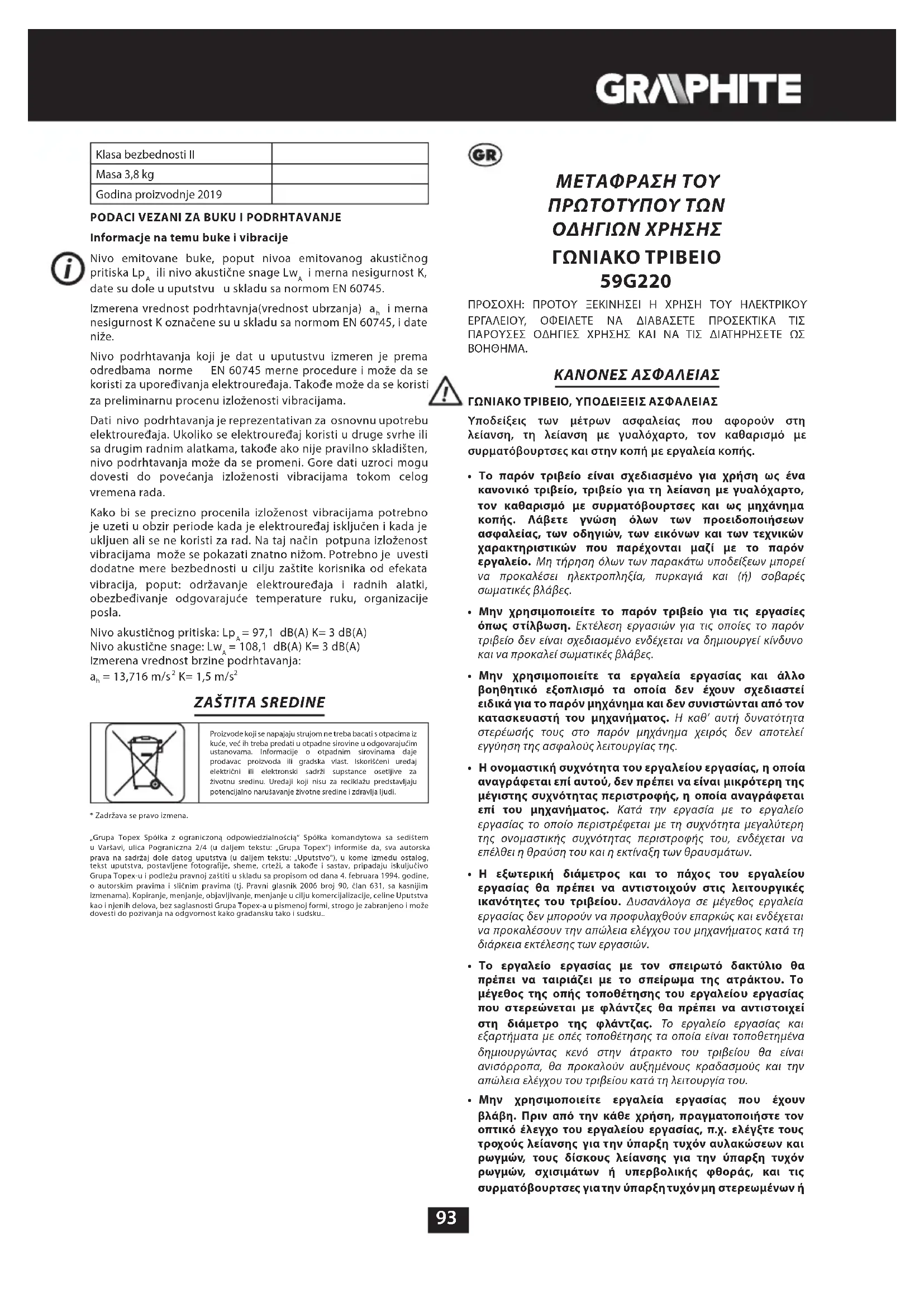 - Τοποθετήστε τα καλύμματα των ψηκτρών άνθρακα (8).99 Μετά από την αντικατάσταση των ψηκτρών άνθρακα, πρέπει να αφήσετε το τριβείο να λειτουργήσει άνευ φορτίου για 1-2 λεπτά για προσαρμογή των λειτουργικών εξαρτημάτων τους στον συλλέκτη του κινητήρα. Η αντικατάσταση των ψηκτρών άνθρακα μπορεί να ανατεθεί μόνο σε αρμόδιο ειδικό. Συνιστούμε να χρησιμοποιείτε μόνο αυθεντικά ανταλλακτικά. Όλες οι δυσλειτουργίες πρέπει να επισκευάζονται από το εξουσιοδοτημένο συνεργείο τεχνικής υποστήριξης του κατασκευαστή. ΤΕΧΝΙΚΑ ΧΑΡΑΚΤΗΡΙΣΤΙΚΑ ΟΝΟΜΑΣΤΙΚΑ ΣΤΟΙΧΕΙΑ Γωνιακό τριβείο 59G220 Παράμετρος Τιμή Τάση λαμβανόμενου ρεύματος 230 V AC Συχνότητα λαμβανόμενου ρεύματος 50 Hz Ονομαστική ισχύς 1200 W Κλίμακα ρύθμισης της συχνότητας περιστροφής 3000 - 11000 min