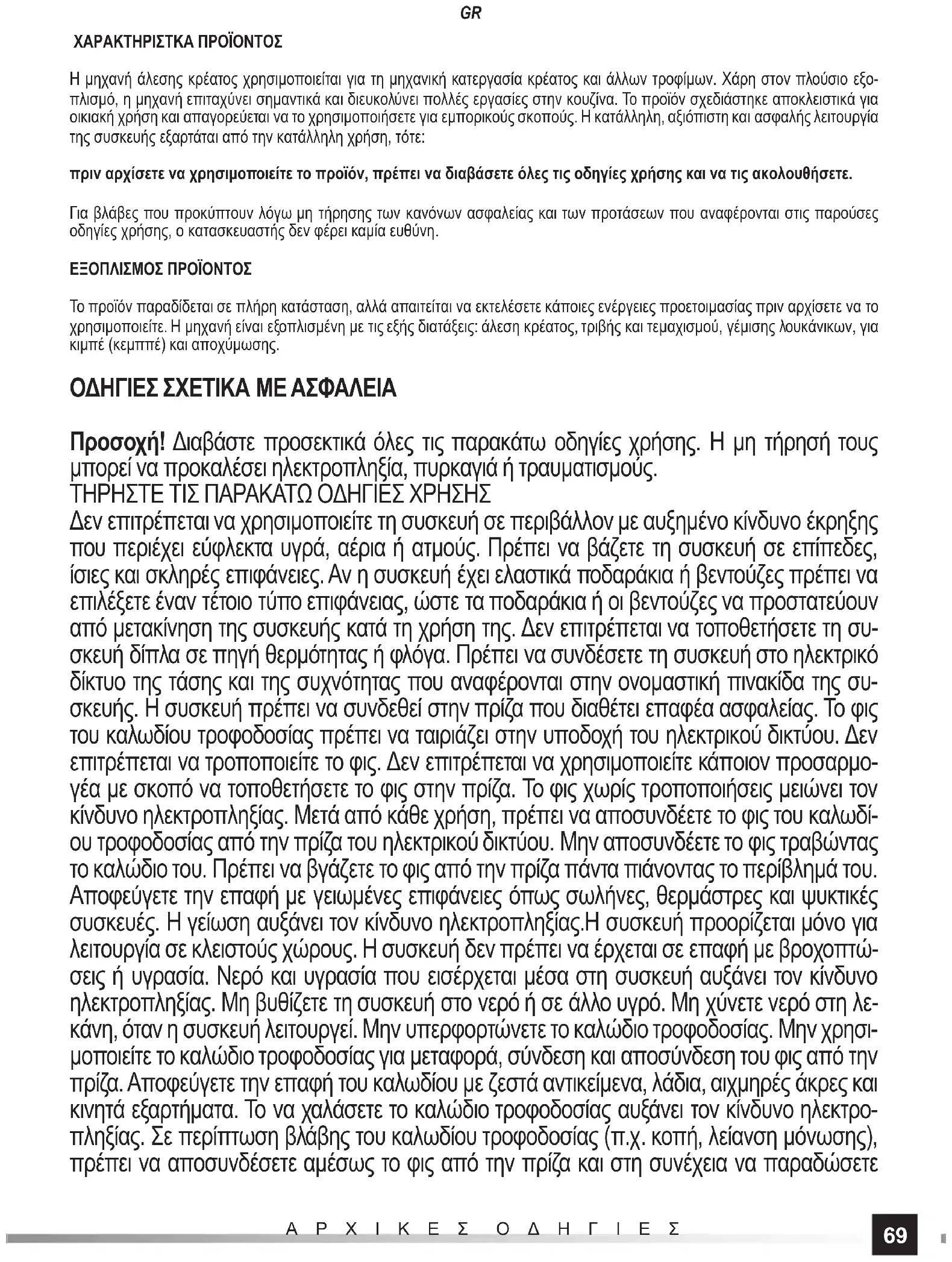 ΕΞΟΠΛΙΣΜΟΣ ΠΡΟΪΟΝΤΟΣ Το προϊόν παραδίδεται σε πλήρη κατάσταση, αλλά απαιτείται να εκτελέσετε κάποιες ενέργειες προετοιμασίας πριν αρχίσετε να το χρησιμοποιείτε. Η μηχανή είναι εξοπλισμένη με τις εξής διατάξεις: άλεση κρέατος, τριβής και τεμαχισμού, γέμισης λουκάνικων, για κιμπέ (κεμππέ) και αποχύμωσης. ΟΔΗΓΙΕΣ ΣΧΕΤΙΚΑ ΜΕ ΑΣΦΑΛΕΙΑ Προσοχή! Διαβάστε προσεκτικά όλες τις παρακάτω οδηγίες χρήσης. Η μη τήρησή τους μπορεί να προκαλέσει ηλεκτροπληξία, πυρκαγιά ή τραυματισμούς. ΤΗΡΗΣΤΕ ΤΙΣ ΠΑΡΑΚΑΤΩ ΟΔΗΓΙΕΣ ΧΡΗΣΗΣ Δεν επιτρέπεται να χρησιμοποιείτε τη συσκευή σε περιβάλλον με αυξημένο κίνδυνο έκρηξης που περιέχει εύφλεκτα υγρά, αέρια ή ατμούς. Πρέπει να βάζετε τη συσκευή σε επίπεδες, ίσιες και σκληρές επιφάνειες. Αν η συσκευή έχει ελαστικά ποδαράκια ή βεντούζες πρέπει να επιλέξετε έναν τέτοιο τύπο επιφάνειας, ώστε τα ποδαράκια ή οι βεντούζες να προστατεύουν από μετακίνηση της συσκευής κατά τη χρήση της. Δεν επιτρέπεται να τοποθετήσετε τη συ- σκευή δίπλα σε πηγή θερμότητας ή φλόγα. Πρέπει να συνδέσετε τη συσκευή στο ηλεκτρικό δίκτυο της τάσης και της συχνότητας που αναφέρονται στην ονομαστική πινακίδα της συ- σκευής. Η συσκευή πρέπει να συνδεθεί στην πρίζα που διαθέτει επαφέα ασφαλείας. Το φις του καλωδίου τροφοδοσίας πρέπει να ταιριάζει στην υποδοχή του ηλεκτρικού δικτύου. Δεν επιτρέπεται να τροποποιείτε το φις. Δεν επιτρέπεται να χρησιμοποιείτε κάποιον προσαρμο- γέα με σκοπό να τοποθετήσετε το φις στην πρίζα. Το φις χωρίς τροποποιήσεις μειώνει τον κίνδυνο ηλεκτροπληξίας. Μετά από κάθε χρήση, πρέπει να αποσυνδέετε το φις του καλωδί- ου τροφοδοσίας από την πρίζα του ηλεκτρικού δικτύου. Μην αποσυνδέετε το φις τραβώντας το καλώδιο του. Πρέπει να βγάζετε το φις από την πρίζα πάντα πιάνοντας το περίβλημά του. Αποφεύγετε την επαφή με γειωμένες επιφάνειες όπως σωλήνες, θερμάστρες και ψυκτικές συσκευές. Η γείωση αυξάνει τον κίνδυνο ηλεκτροπληξίας.Η συσκευή προορίζεται μόνο για λειτουργία σε κλειστούς χώρους. Η συσκευή δεν πρέπει να έρχεται σε επαφή με βροχοπτώ- σεις ή υγρασία. Νερό και υγρασία που εισέρχεται μέσα στη συσκευή αυξάνει τον κίνδυνο ηλεκτροπληξίας. Μη βυθίζετε τη συσκευή στο νερό ή σε άλλο υγρό. Μη χύνετε νερό στη λε- κάνη, όταν η συσκευή λειτουργεί. Μην υπερφορτώνετε το καλώδιο τροφοδοσίας. Μην χρησι- μοποιείτε το καλώδιο τροφοδοσίας για μεταφορά, σύνδεση και αποσύνδεση του φις από την πρίζα. Αποφεύγετε την επαφή του καλωδίου με ζεστά αντικείμενα, λάδια, αιχμηρές άκρες και κινητά εξαρτήματα. Το να χαλάσετε το καλώδιο τροφοδοσίας αυξάνει τον κίνδυνο ηλεκτρο- πληξίας. Σε περίπτωση βλάβης του καλωδίου τροφοδοσίας (π.χ. κοπή, λείανση μόνωσης), πρέπει να αποσυνδέσετε αμέσως το φις από την πρίζα και στη συνέχεια να παραδώσετε70 ΑΡΧΙΚΕΣ ΟΔΗΓΙΕΣ