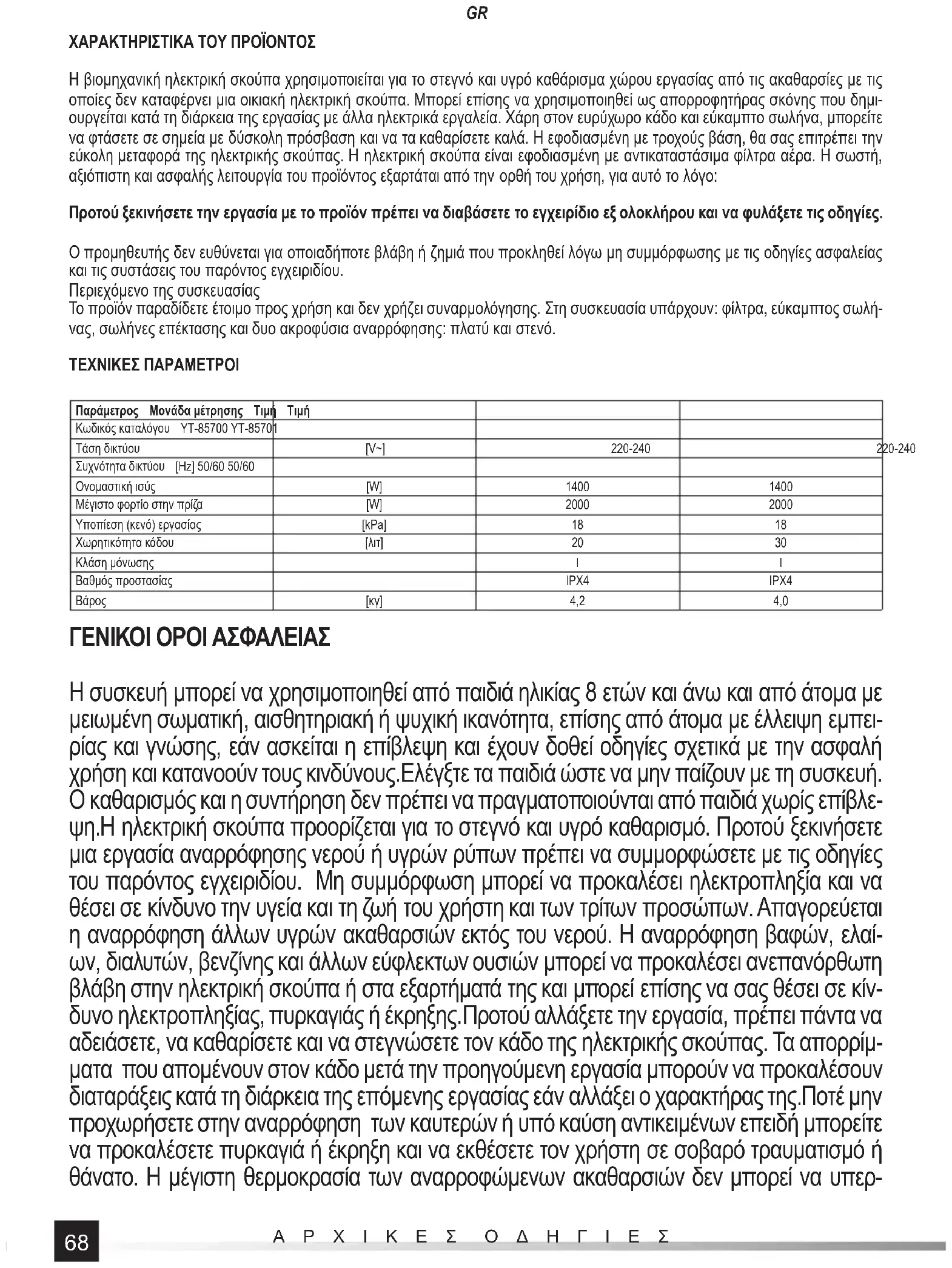 ΧΑΡΑΚΤΗΡΙΣΤΙΚΑ ΤΟΥ ΠΡΟΪΟΝΤΟΣ Η βιομηχανική ηλεκτρική σκούπα χρησιμοποιείται για το στεγνό και υγρό καθάρισμα χώρου εργασίας από τις ακαθαρσίες με τις οποίες δεν καταφέρνει μια οικιακή ηλεκτρική σκούπα. Μπορεί επίσης να χρησιμοποιηθεί ως απορροφητήρας σκόνης που δημι- ουργείται κατά τη διάρκεια της εργασίας με άλλα ηλεκτρικά εργαλεία. Χάρη στον ευρύχωρο κάδο και εύκαμπτο σωλήνα, μπορείτε να φτάσετε σε σημεία με δύσκολη πρόσβαση και να τα καθαρίσετε καλά. Η εφοδιασμένη με τροχούς βάση, θα σας επιτρέπει την εύκολη μεταφορά της ηλεκτρικής σκούπας. Η ηλεκτρική σκούπα είναι εφοδιασμένη με αντικαταστάσιμα φίλτρα αέρα. Η σωστή, αξιόπιστη και ασφαλής λειτουργία του προϊόντος εξαρτάται από την ορθή του χρήση, για αυτό το λόγο: Προτού ξεκινήσετε την εργασία με το προϊόν πρέπει να διαβάσετε το εγχειρίδιο εξ ολοκλήρου και να φυλάξετε τις οδηγίες. Ο προμηθευτής δεν ευθύνεται για οποιαδήποτε βλάβη ή ζημιά που προκληθεί λόγω μη συμμόρφωσης με τις οδηγίες ασφαλείας και τις συστάσεις του παρόντος εγχειριδίου. Περιεχόμενο της συσκευασίας Το προϊόν παραδίδετε έτοιμο προς χρήση και δεν χρήζει συναρμολόγησης. Στη συσκευασία υπάρχουν: φίλτρα, εύκαμπτος σωλή- νας, σωλήνες επέκτασης και δυο ακροφύσια αναρρόφησης: πλατύ και στενό. ΤΕΧΝΙΚΕΣ ΠΑΡΑΜΕΤΡΟΙ Παράμετρος Μονάδα μέτρησης Τιμή Τιμή Κωδικός καταλόγου YT-85700 YT-85701 Τάση δικτύου [V~] 220-240 220-240 Συχνότητα δικτύου [Hz] 50/60 50/60 Ονομαστική ισύς [W] 1400 1400 Μέγιστο φορτίο στην πρίζα [W] 2000 2000 Υποπίεση (κενό) εργασίας [kPa] 18 18 Χωρητικότητα κάδου [λιτ]20 30 Κλάση μόνωσης II Βαθμός προστασίας IPX4 IPX4 Βάρος [κγ] 4,2 4,0 ΓΕΝΙΚΟΙ ΟΡΟΙ ΑΣΦΑΛΕΙΑΣ Η συσκευή μπορεί να χρησιμοποιηθεί από παιδιά ηλικίας 8 ετών και άνω και από άτομα με μειωμένη σωματική, αισθητηριακή ή ψυχική ικανότητα, επίσης από άτομα με έλλειψη εμπει- ρίας και γνώσης, εάν ασκείται η επίβλεψη και έχουν δοθεί οδηγίες σχετικά με την ασφαλή χρήση και κατανοούν τους κινδύνους.Ελέγξτε τα παιδιά ώστε να μην παίζουν με τη συσκευή. Ο καθαρισμός και η συντήρηση δεν πρέπει να πραγματοποιούνται από παιδιά χωρίς επίβλε- ψη.Η ηλεκτρική σκούπα προορίζεται για το στεγνό και υγρό καθαρισμό. Προτού ξεκινήσετε μια εργασία αναρρόφησης νερού ή υγρών ρύπων πρέπει να συμμορφώσετε με τις οδηγίες του παρόντος εγχειριδίου. Μη συμμόρφωση μπορεί να προκαλέσει ηλεκτροπληξία και να θέσει σε κίνδυνο την υγεία και τη ζωή του χρήστη και των τρίτων προσώπων. Απαγορεύεται η αναρρόφηση άλλων υγρών ακαθαρσιών εκτός του νερού. Η αναρρόφηση βαφών, ελαί- ων, διαλυτών, βενζίνης και άλλων εύφλεκτων ουσιών μπορεί να προκαλέσει ανεπανόρθωτη βλάβη στην ηλεκτρική σκούπα ή στα εξαρτήματά της και μπορεί επίσης να σας θέσει σε κίν- δυνο ηλεκτροπληξίας, πυρκαγιάς ή έκρηξης.Προτού αλλάξετε την εργασία, πρέπει πάντα να αδειάσετε, να καθαρίσετε και να στεγνώσετε τον κάδο της ηλεκτρικής σκούπας. Τα απορρίμ- ματα που απομένουν στον κάδο μετά την προηγούμενη εργασία μπορούν να προκαλέσουν διαταράξεις κατά τη διάρκεια της επόμενης εργασίας εάν αλλάξει ο χαρακτήρας της.Ποτέ μην προχωρήσετε στην αναρρόφηση των καυτερών ή υπό καύση αντικειμένων επειδή μπορείτε να προκαλέσετε πυρκαγιά ή έκρηξη και να εκθέσετε τον χρήστη σε σοβαρό τραυματισμό ή θάνατο. Η μέγιστη θερμοκρασία των αναρροφώμενων ακαθαρσιών δεν μπορεί να υπερ-69 ΑΡΧΙΚΕΣ ΟΔΗΓΙΕΣ
