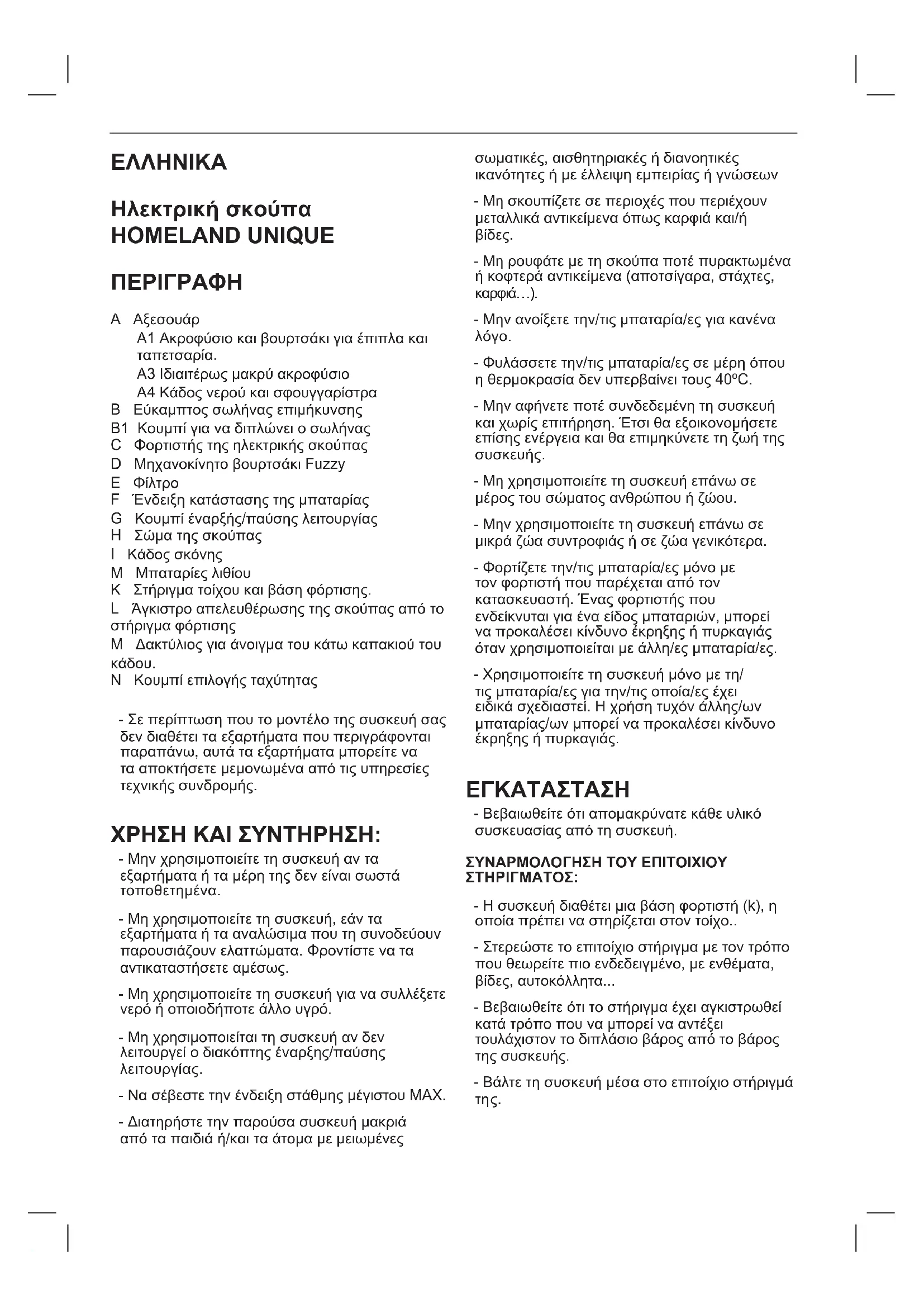 - Μη χρησιμοποιείτε τη συσκευή επάνω σε μέρος του σώματος ανθρώπου ή ζώου. - Μην χρησιμοποιείτε τη συσκευή επάνω σε μικρά ζώα συντροφιάς ή σε ζώα γενικότερα. - Φορτίζετε την/τις μπαταρία/ες μόνο με τον φορτιστή που παρέχεται από τον κατασκευαστή. Ένας φορτιστής που ενδείκνυται για ένα είδος μπαταριών, μπορεί να προκαλέσει κίνδυνο έκρηξης ή πυρκαγιάς όταν χρησιμοποιείται με άλλη/ες μπαταρία/ες. - Χρησιμοποιείτε τη συσκευή μόνο με τη/ τις μπαταρία/ες για την/τις οποία/ες έχει ειδικά σχεδιαστεί. Η χρήση τυχόν άλλης/ων μπαταρίας/ων μπορεί να προκαλέσει κίνδυνο έκρηξης ή πυρκαγιάς. ΕΓΚΆΤΆΣΤΆΣΗ - Βεβαιωθείτε ότι απομακρύνατε κάθε υλικό συσκευασίας από τη συσκευή. ΣΥΝΆΡΜΟΛΟΓΗΣΗ ΤΟΥ ΕΠΙΤΟΙΧΙΟΥ ΣΤΗΡΙΓΜΆΤΟΣ: - Η συσκευή διαθέτει μια βάση φορτιστή (k), η οποία πρέπει να στηρίζεται στον τοίχο.. - Στερεώστε το επιτοίχιο στήριγμα με τον τρόπο που θεωρείτε πιο ενδεδειγμένο, με ενθέματα, βίδες, αυτοκόλλητα... - Βεβαιωθείτε ότι το στήριγμα έχει αγκιστρωθεί κατά τρόπο που να μπορεί να αντέξει τουλάχιστον το διπλάσιο βάρος από το βάρος της συσκευής. - Βάλτε τη συσκευή μέσα στο επιτοίχιο στήριγμά της.ΦΟΡΤΙΣΗ ΤΗΣ ΜΠΆΤΆΡΙΆΣ - Προειδοποίηση: Η καινούργια μπαταρία δεν είναι πλήρως φορτισμένη, και πρέπει να φορτιστεί στο μέγιστο πριν τη χρήση της συσκευής για πρώτη φορά. - Φορτίστε την μπαταρία σε θερμοκρασία δωματίου μεταξύ 4 και 40 ºC. - Συνδέσετε τον φορτιστή στο ρεύμα. - Θα ανάψει μια ένδειξη που δείχνει ότι ο φορτιστής είναι έτοιμος να ξεκινήσει τη φόρτιση της μπαταρίας. - Ο αναγκαίος χρόνος για μια πλήρη φόρτιση κυμαίνεται από 4 έως 5 ώρες περίπου. Μην προσπαθήσετε ποτέ να υπερφορτίσετε τις μπαταρίες (μολονότι η πρώτη φόρτιση προτείνεται να διαρκέσει 6 ώρες). - Ενώ φορτίζεται η μπαταρία, ανάβει η ένδειξη που δείχνει ότι ο φορτιστής φορτίζει την