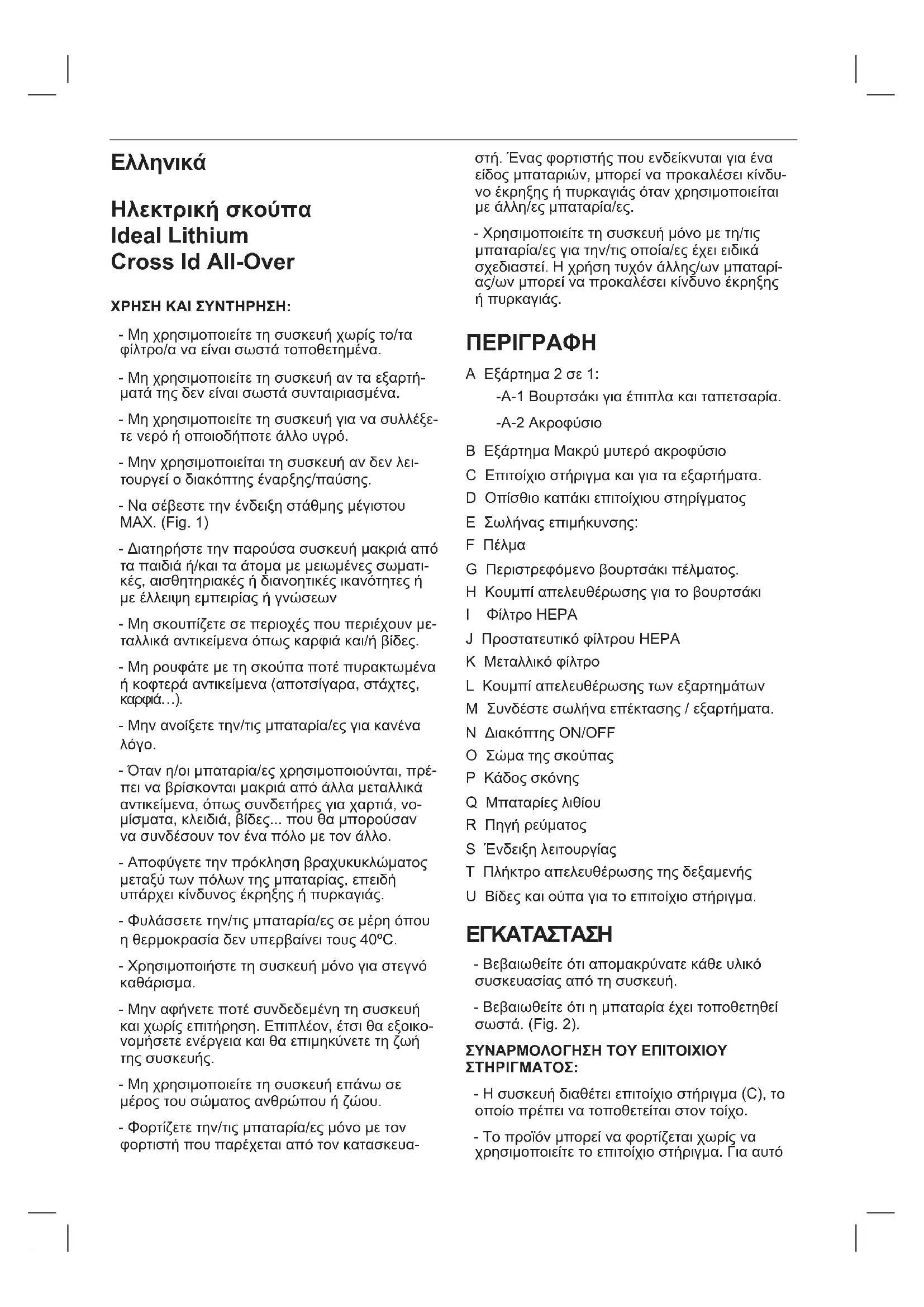 CAŁKOWITYM ZUŻYCIU URZĄDZENIA, NALEŻY: - Pociągnąć akumulator do góry, aby wyciągnąć go z obudowy. (Rys. 11).Ελληνικά Ηλεκτρική σκούπα Ideal Lithium Cross Id All-Over ΧΡΗΣΗ ΚΑΙ ΣΥΝΤΗΡΗΣΗ: - Μη χρησιμοποιείτε τη συσκευή χωρίς το/τα φίλτρο/α να είναι σωστά τοποθετημένα. - Μη χρησιμοποιείτε τη συσκευή αν τα εξαρτή- ματά της δεν είναι σωστά συνταιριασμένα. - Μη χρησιμοποιείτε τη συσκευή για να συλλέξε- τε νερό ή οποιοδήποτε άλλο υγρό. - Μην χρησιμοποιείται τη συσκευή αν δεν λει- τουργεί ο διακόπτης έναρξης/παύσης. - Να σέβεστε την ένδειξη στάθμης μέγιστου MAX. (Fig. 1) - Διατηρήστε την παρούσα συσκευή μακριά από τα παιδιά ή/και τα άτομα με μειωμένες σωματι- κές, αισθητηριακές ή διανοητικές ικανότητες ή με έλλειψη εμπειρίας ή γνώσεων - Μη σκουπίζετε σε περιοχές που περιέχουν με- ταλλικά αντικείμενα όπως καρφιά και/ή βίδες. - Μη ρουφάτε με τη σκούπα ποτέ πυρακτωμένα ή κοφτερά αντικείμενα (αποτσίγαρα, στάχτες,